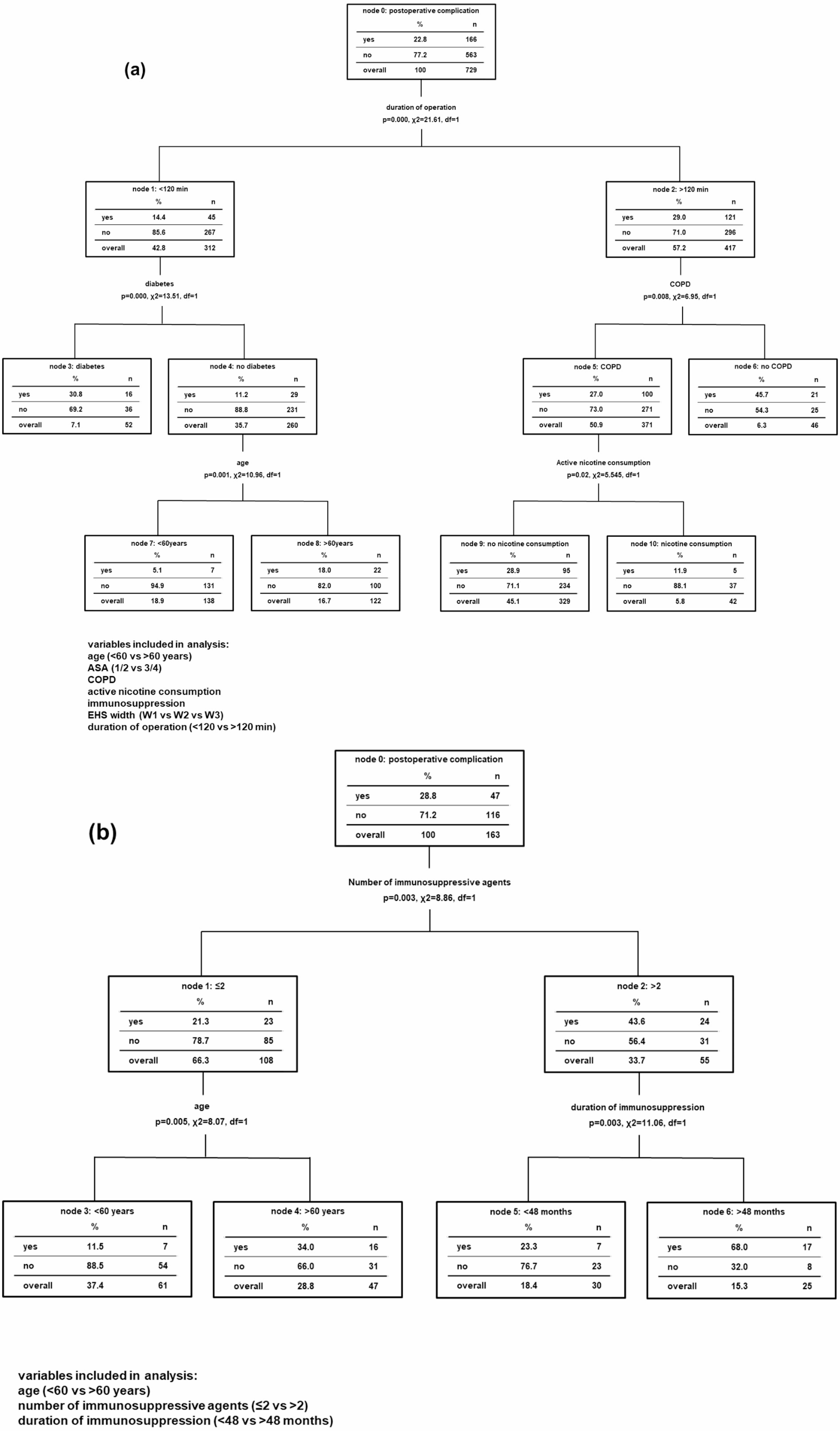 Classification and regression tree (CART)-analysis on impact of clinical variables on occurence of postoperative complications after incisional ventral hernia repair using mesh. To investigate and rank the relevance of clinical variables with putative influence on postoperative complications, CART method was used. Regression tree classified patients in this study for their associated variables in regard of occurrence of postoperative complications. Nodes indicate parameters that significantly improve correct classification and hereby decrease impurity toward the terminal (upper) nodes. Variables with statistically significant impact in univariate analysis were implemented. (a) In the overall cohort, duration of operation showed most relevant impact, and in the subgroup of patients operated < 120 min, diabetes mellitus was of importance, while combination of COPD and prolonged length of operation led to increase of postoperative complication. (b) In the cohort of immunosuppressed patients, the number of immunosuppressive agents was of most meaningful impact. Here, in patients with up to two agents, increased age was next-ranking factor, while history of immunosuppression exceeding four years was of relevance in patients with more than two different pharmaceuticals