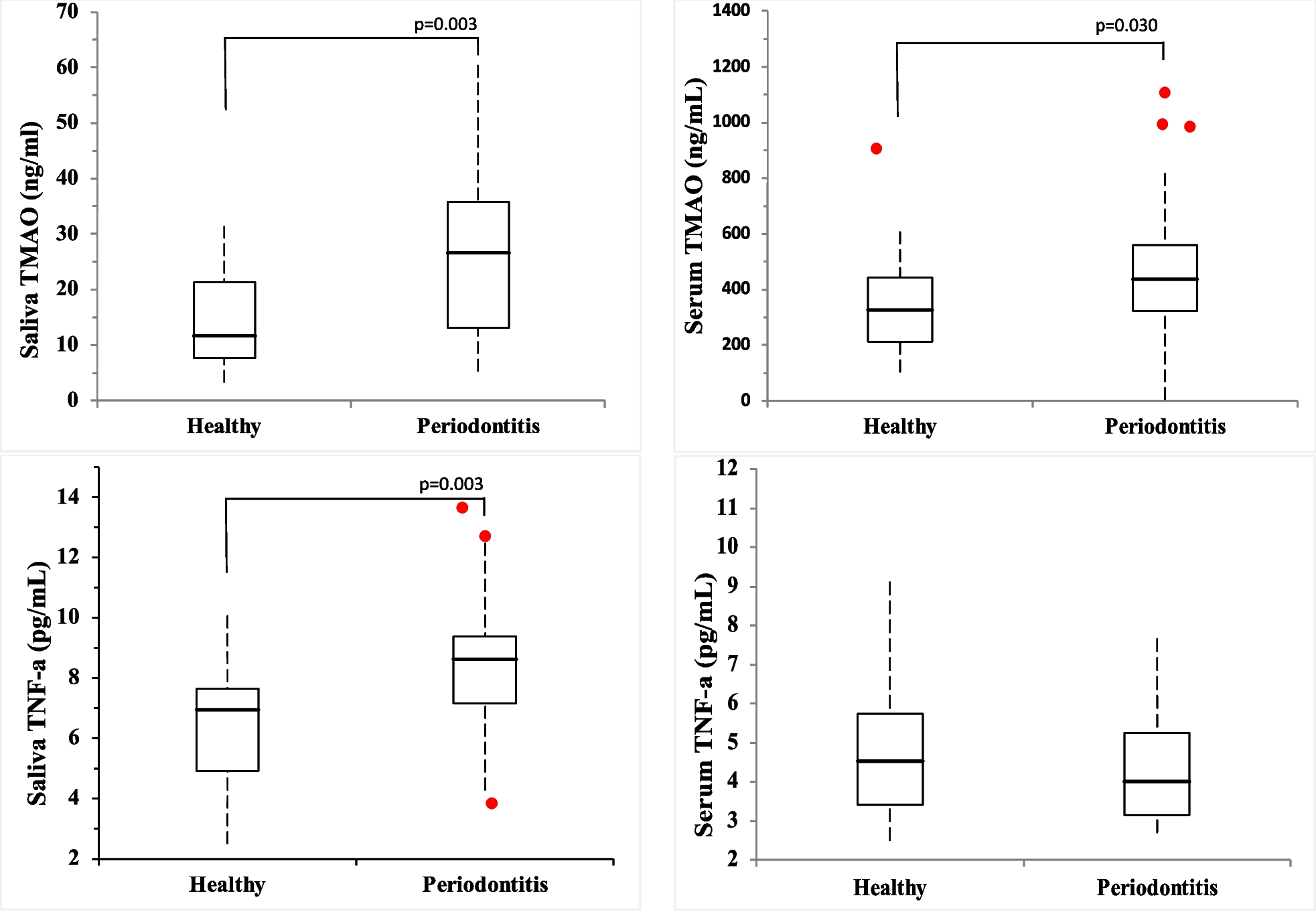 14]. Unlike serum TMAO, salivary TMAO offers a novel, non-invasive diagnostic approach that can be integrated into routine clinical evaluations. This perspective underscores the unique value of salivary biomarkers, particularly for localized inflammatory conditions like periodontitis, and highlights their potential in bridging oral and systemic health diagnostics. This study aims to evaluate the independent effects of periodontitis on TMAO and TNF-α levels in saliva and serum. By focusing on salivary TMAO, the study provides novel insights into its potential as a localized biomarker and highlights its diagnostic utility in non-invasive clinical applications, advancing our understanding of its link to cardiovascular disease pathways.