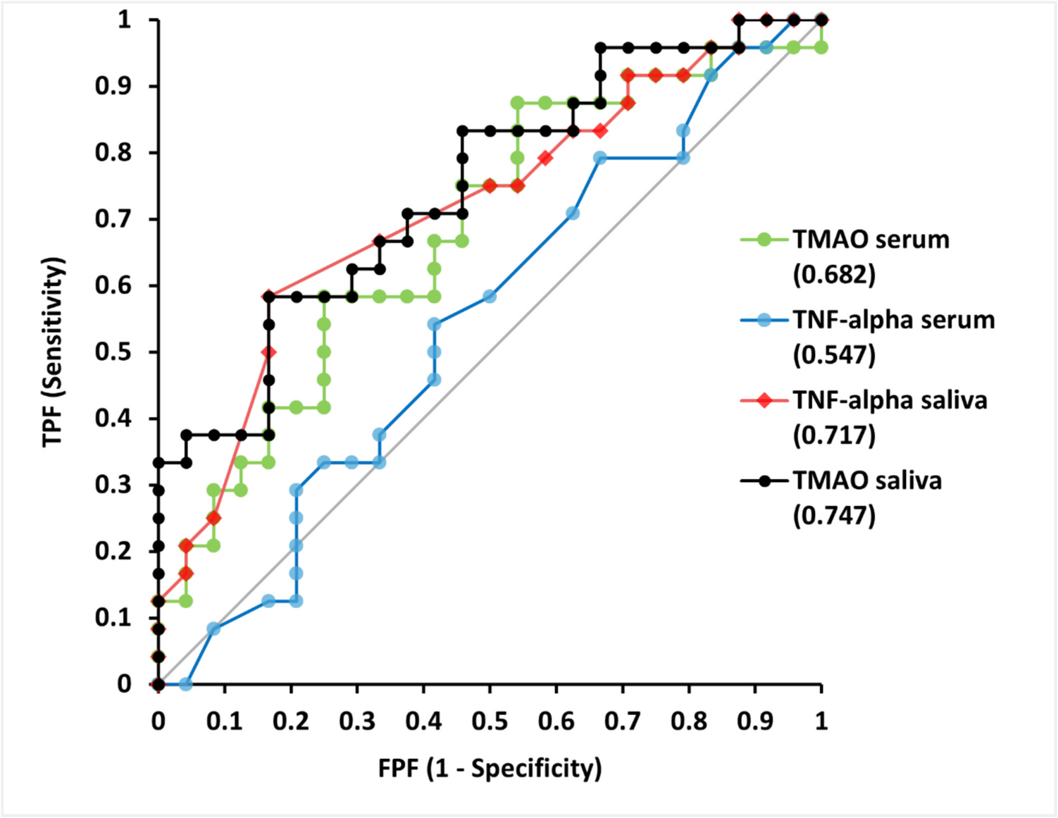 This study contributes to the growing body of evidence suggesting that salivary TMAO may serve as a potential biomarker for periodontal inflammation, demonstrating strong correlations between TMAO, TNF-α, and clinical periodontal parameters. Importantly, ordinal regression analyses confirmed that higher salivary TNF-α and TMAO levels were significantly associated with higher odds of periodontitis, even after adjusting for age, reinforcing their relevance as potential indicators of periodontal disease risk. While aMMP-8 has been widely studied as an indicator of periodontal tissue degradation, TMAO appears to provide complementary information, reflecting broader inflammatory pathways that may bridge oral and systemic health. However, given the complexity of TMAO metabolism and its interactions with microbial and host inflammatory responses, further studies are needed to determine its specificity and utility in clinical practice. Future research should focus on longitudinal studies, in vitro and in vivo mechanistic analyses, and microbiome-metabolome integrations to better understand TMAO’s role in periodontitis pathogenesis and its potential application in personalized periodontal diagnostics and therapeutic strategies.