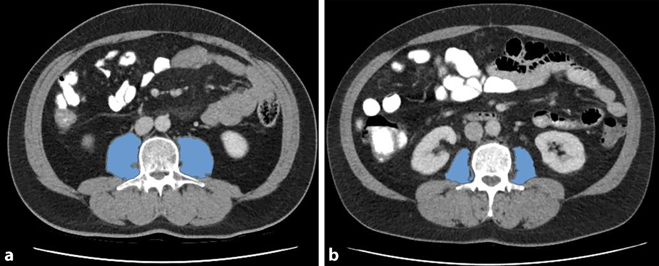 a Männlicher Patient ohne Sarkopenie, PMI-Wert: 8,75 cm2 m−2; b männlicher Patient mit Sarkopenie, PMI-Wert: 4,30 cm2 m−2