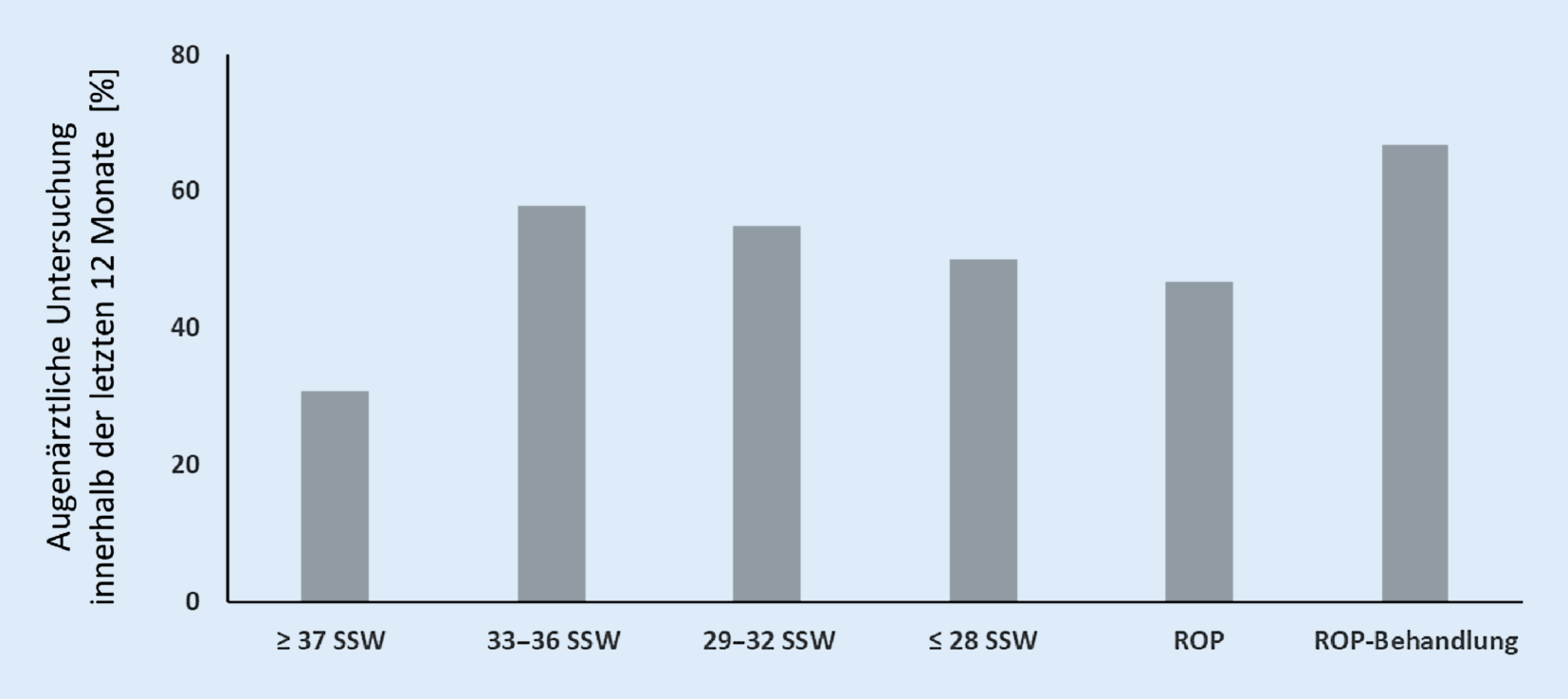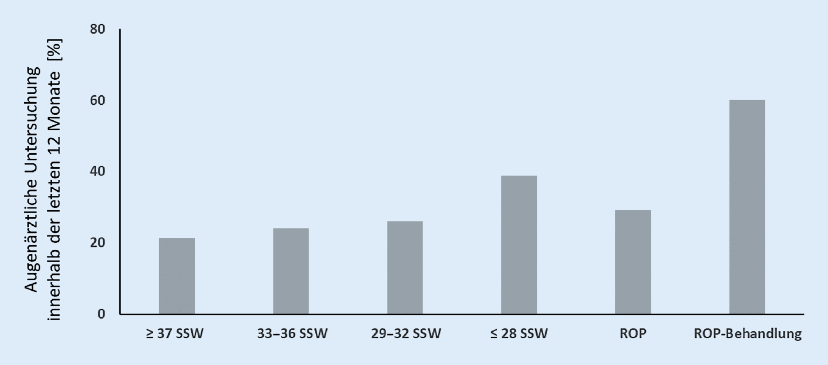 Extrem frühgeborene Personen mit und ohne postnatale ROP zeigten die höchste Rate an Augenerkrankungen sowie die höchste Rate an augenärztlichen Kontrolluntersuchungen innerhalb der letzten 12 Monate. Dies deutet darauf hin, dass extrem frühgeborene Personen insbesondere mit postnataler ROP insgesamt lebenslang häufigere augenärztliche Kontrolluntersuchungen wahrnehmen.