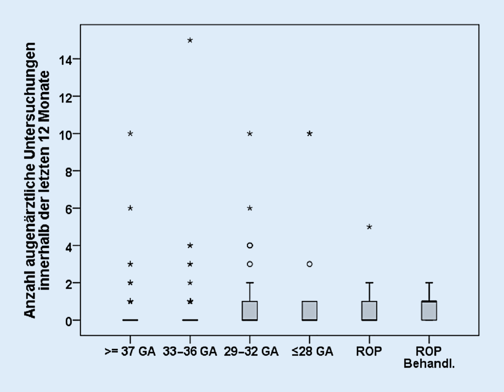 Die Gutenberg Prematurity Eye Study (GPES) ist eine retrospektive Kohortenstudie mit einer prospektiven augenärztlichen Untersuchung von ehemaligen früh- und reifgeborenen Personen, geboren zwischen 1969 und 2002 (aktuelles Alter 18 bis 52 Jahre). Alle Teilnehmenden wurden hinsichtlich amblyogener Parameter wie z. B. dem Vorliegen eines Strabismus und von Refraktionsfehlern untersucht. Die Teilnehmenden wurden gruppiert in Personen mit normalem Gestationsalter (GA) ≥ 37 (Kontrollgruppe), Frühgeborene ohne ROP mit GA 33–36 (Gruppe 2), GA 29–32 (Gruppe 3), GA ≤ 28 Wochen (Gruppe 4) und solche mit ROP ohne Behandlung (Gruppe 5) und mit ROP mit Behandlung (Gruppe 6). Es wurde von allen Teilnehmenden erhoben, wie oft sie innerhalb der letzten 12 Monate bei einer augenärztlichen Untersuchung gewesen sind.