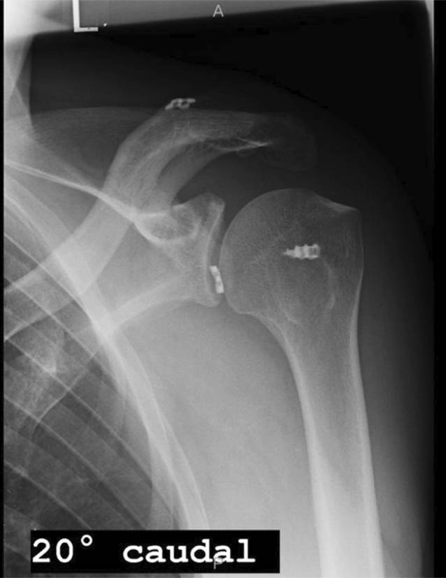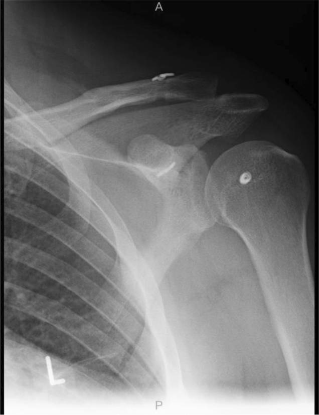 In der durchgeführten radiologischen Bildgebung stellte sich eine chronische ACG-Instabilität mit einem erhöhten CC-Abstand dar. Es imponierte ein nach intraartikulär disloziertes inferiores DogBone-Plättchen (Abb. 2). In der Magnetresonanztomographie (MRT) zeigten sich eine intakte Rotatorenmanschette sowie Knorpelschäden am Humerus im Sinne einer beginnenden Omarthrose.