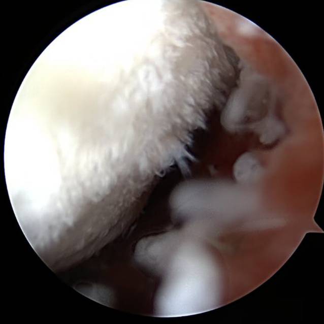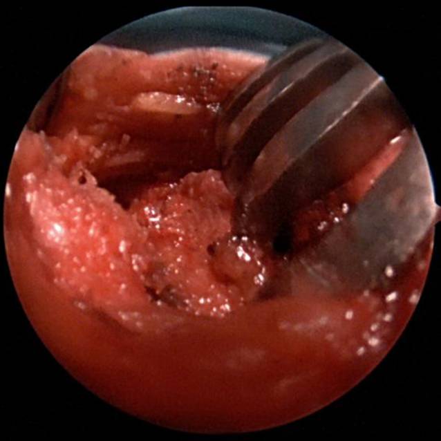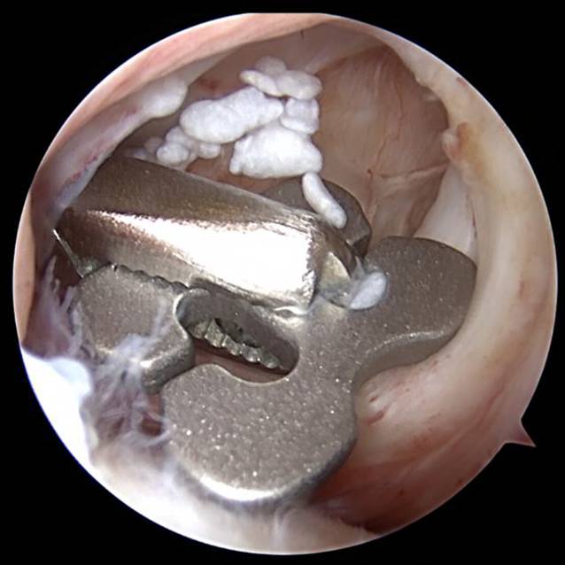 Die arthroskopische Bergung des dislozierten DogBone-Buttons wird eingeleitet.