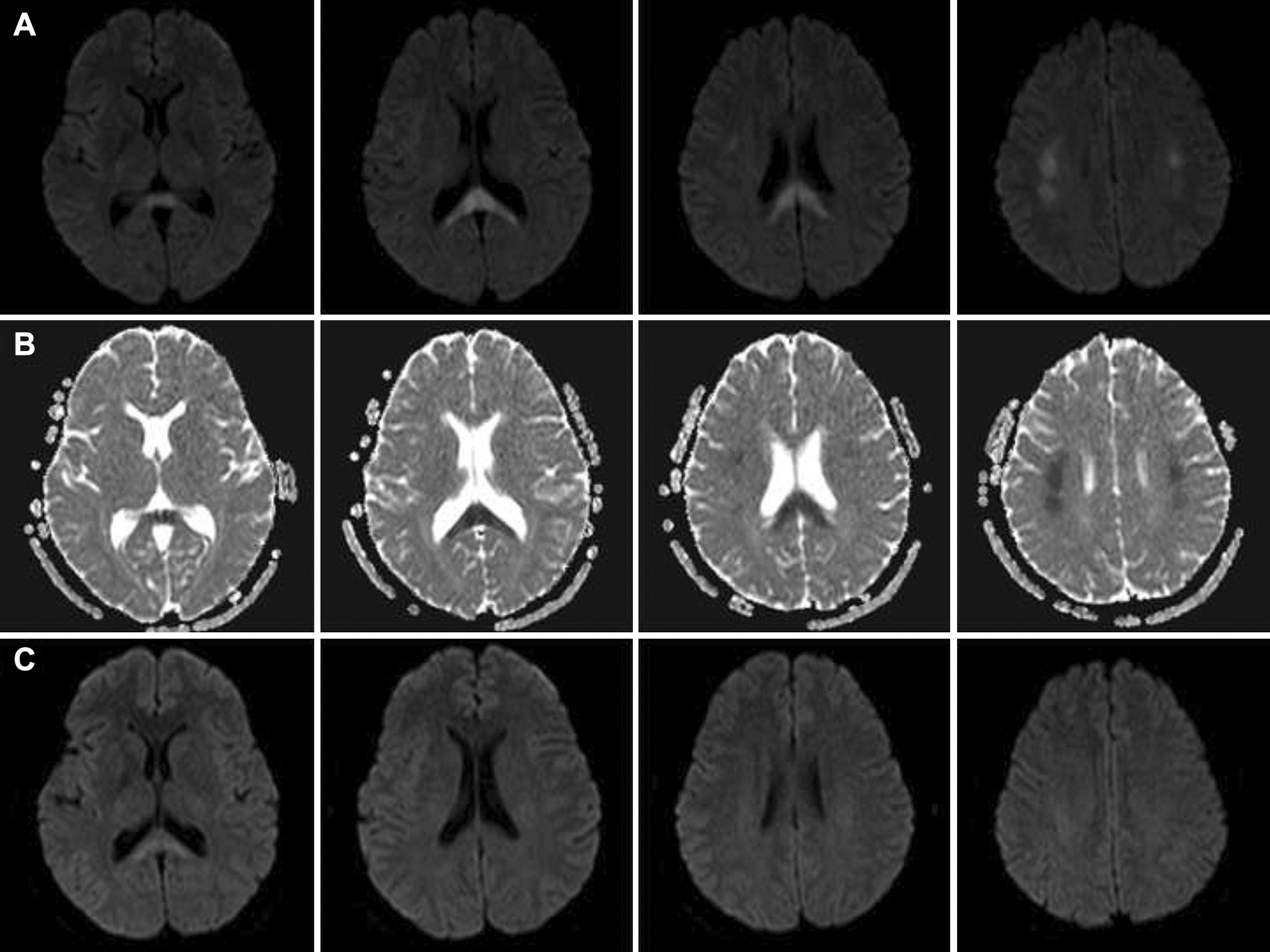 Brain MRI two months before. Paired axial diffusion-weighted imaging and apparent diffusion coefficient map showed symmetric foci of restricted diffusion involving the corpus callosum splenium and periventricular white matter A, B. After 12 days of treatment, the above lesions significantly subsided C and the corresponding lesions largely disappeared on T2-weighted imaging and fluid-attenuated inversion recovery map (unshown)