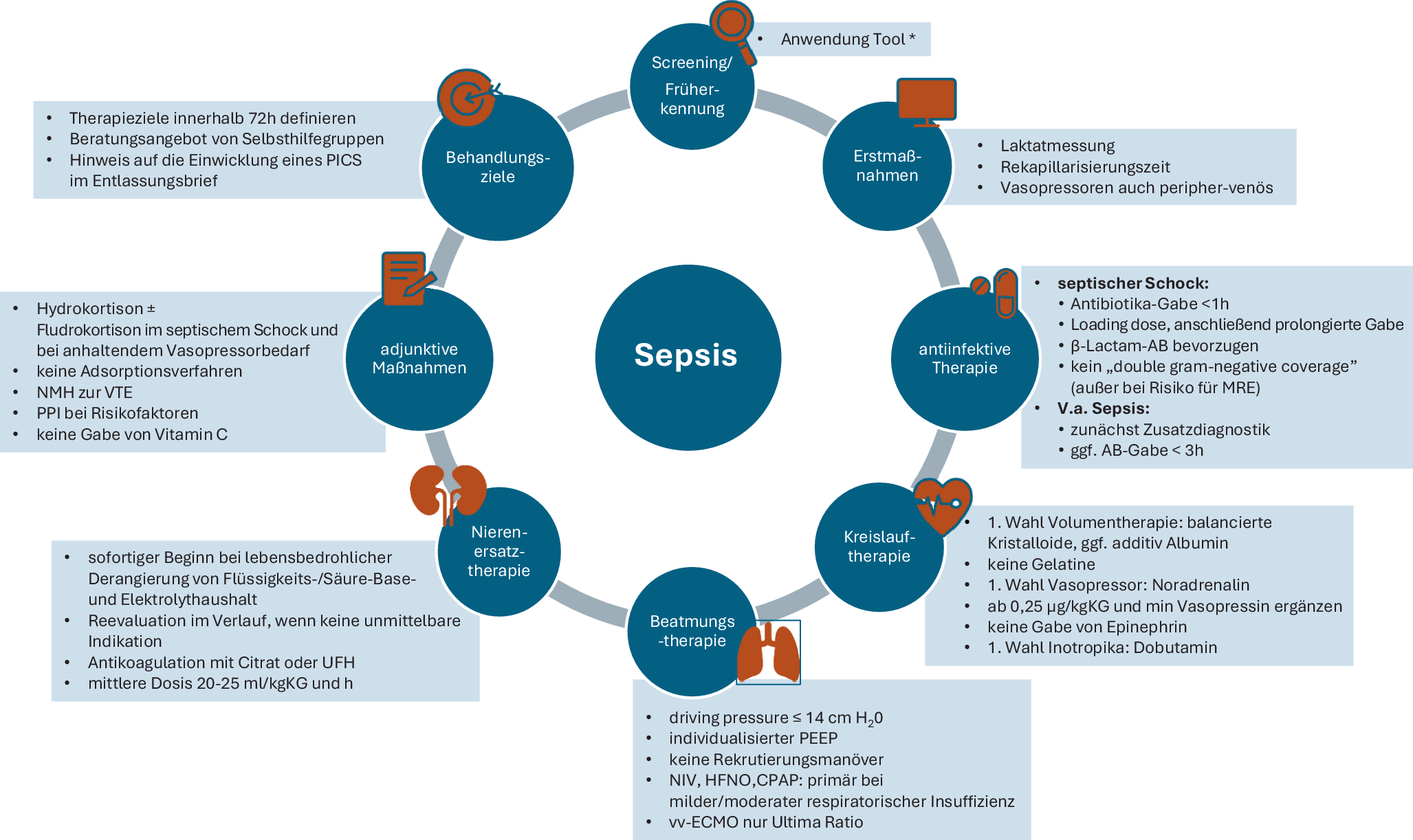 Eine konsequente Unterstützung der Organfunktionen sowie eine engmaschige Reevaluation der Hämodynamik sind entscheidend, um die Therapie bei Bedarf anzupassen und die bestmöglichen Ergebnisse für den Patienten zu erzielen.