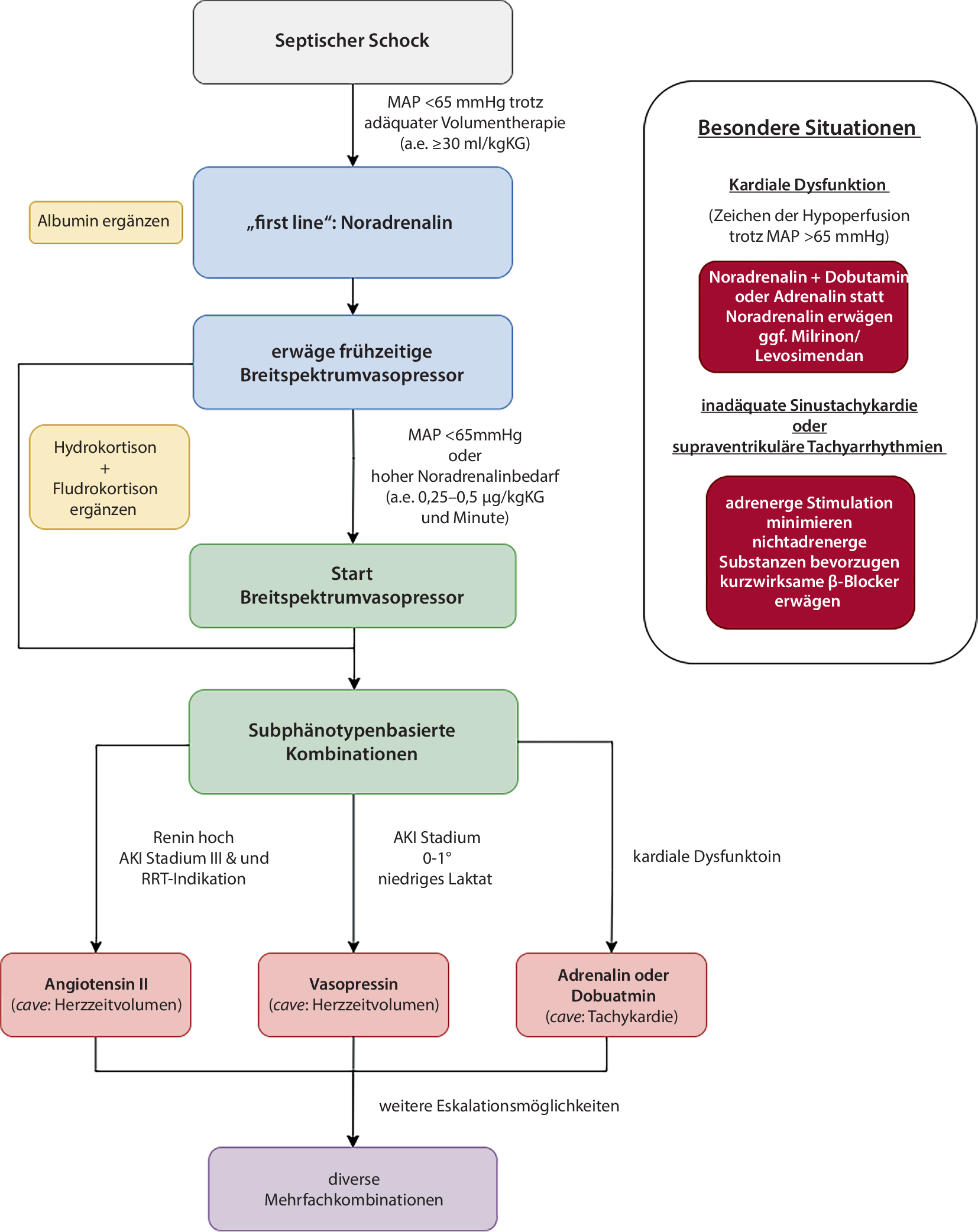Bei kardialer Dysfunktion kann eine Ergänzung mit Dobutamin versucht werden. Gegebenenfalls kann, z. B. bei Erfolglosigkeit von Inotropika, unter Berücksichtigung der kardialen Funktion auch eine Umstellung von Noradrenalin auf Adrenalin erwogen werden. Auch Inodilatatoren, wie Levosimendan oder Milrinon, können in Einzelfällen erwogen werden.