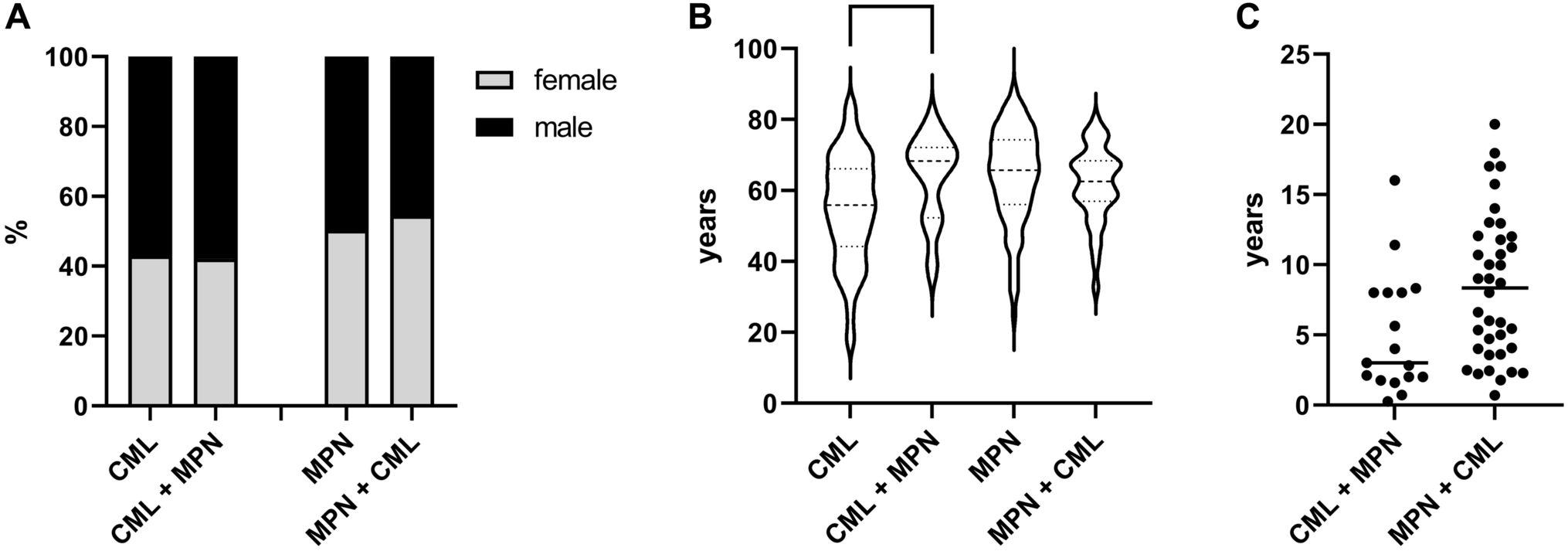 Analysis of distribution of sex and age and impact of time between first and secondary diagnosed MPN on development of secondary BCR::ABL1-negative MPN or CML. A, The distribution of sex was similar in the patients with CML + MPN and MPN + CML compared to their control groups. B, There were no significant differences in the age at the time point of first diagnosed CML or BCR::ABL1-negative MPN compared to their control groups (ns not significant). C, Time between first and secondary diagnosed CML or BCR::ABL1-negative MPN had a wide range without a critical time point for frequent diagnoses of secondary BCR::ABL1-negative MPN or CML