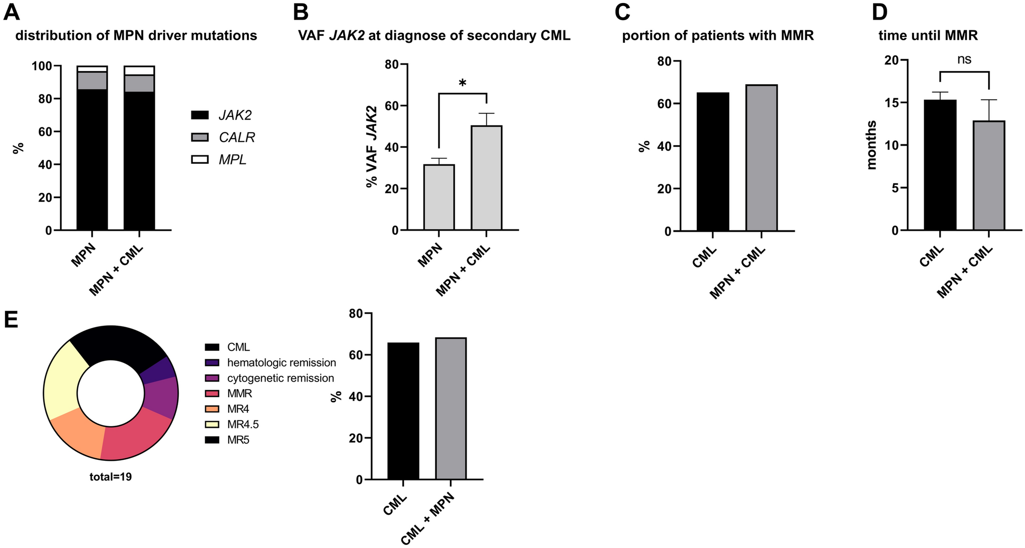 Influence of kind of driver mutation, mutational burden of JAK2, and remission status of CML on development of secondary CML or BCR::ABL1-negative MPN. A, The distribution of driver mutations was comparable to the control group. B, Patients with BCR::ABL-negative MPN and secondary CML had a significantly higher VAF of JAK2 at the time point of diagnosed CML compared to the control group. C, The portion of patients with MPN + CML that reached MMR under treatment with TKI was similar to the control group. D, In the group of patients with MPN + CML, the time until reaching MMR under treatment with TKI was comparable to the control group. E, The portion of patients with MMR or better in the group of patients with CML + MPN when BCR::ABL1-negative MPN was diagnosed was similar to the control group.