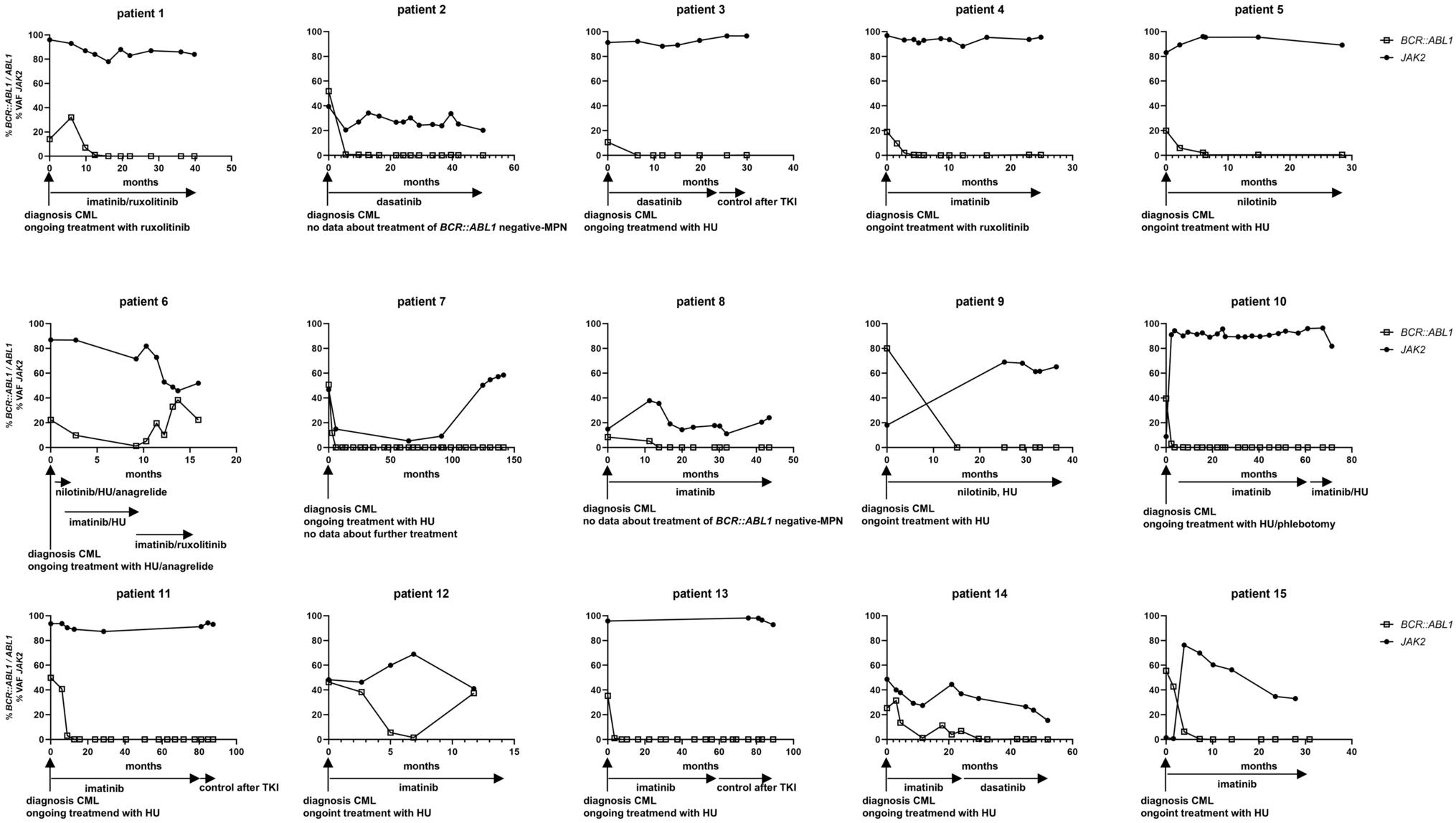 The association between the two different MPN clones in cases of coexisting CML and BCR::ABL1-negative MPN is controversially discussed in the literature [8, 16]. To investigate the connection between the BCR::ABL1 fusion clone and the JAK2-mutated clone, we analyzed the mutational burden of JAK2 at diagnosis of BCR::ABL1-negative MPN and at diagnosis of CML in 7 patients. At the time of diagnosis of CML, 3 patients (pat. no 2, 3, 7) showed a stable VAF of JAK2 mutation, 2 patients (pat. no 1, 4) showed a higher VAF of JAK2 mutation, and 2 patients (pat. no 5, 6) had a lower VAF of JAK2 mutation compared to the VAF at time of diagnosis of JAK2-mutated MPN (Table 1). Furthermore, we analyzed the course of VAF of JAK2 mutations during CML therapy with TKI in 15 patients with MPN + CML. Most patients (n = 10, 67%) showed an independent course of the VAF of JAK2 mutations and BCR::ABL1 transcript levels (pat. no 1–5, 9–13, Fig. 4). While BCR::ABL1 transcript levels decreased with TKI treatment, the VAF of JAK2 was not affected by this therapy or increased during the course of treatment. In these cases, a clear influence of the BCR::ABL1-negative MPN specific therapy (ruxolitinib or hydroxyurea) on JAK2 VAF was not observed. Due to the small number of patients, this observation is limited to patients 1, 9, and 10, who were treated with TKI and ruxolitinib or hydroxyurea. In all other cases (pat. no 6–8, 14, 15), JAK2 VAF decreased after TKI therapy was initiated. Patient 6 was the only one who received treatment of BCR::ABL1-negative MPN with hydroxyurea, followed by ruxolitinib. In all other cases, decreasing JAK2 levels were not induced by BCR::ABL1-negative MPN specific therapy. These data support the theory that the two different MPN clones can be independent of each other, but there are exceptions with a possible dependency of the mutational burden of JAK2 mutation and BCR::ABL1 transcript level.