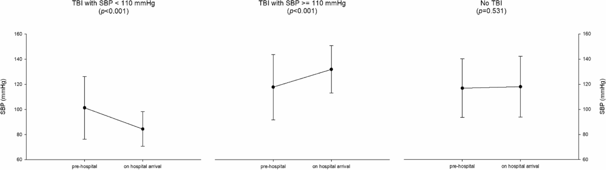 During the study period, a total of 308 cases were recorded in the IATR. Of them, 21 were excluded (17 patients had missing values for either pre- or in-hospital SBP and four patients suffered cardiac arrest during transport), and 287 patients were finally included in the analysis. A total of 142 patients had TBI, of them 50 patients (17%) had TBI and hypotension on hospital arrival (group 1), 92 (32%) suffered TBI but were not hypotensive on hospital arrival (group 2); 145 (51%) patients did not have TBI (group 3).