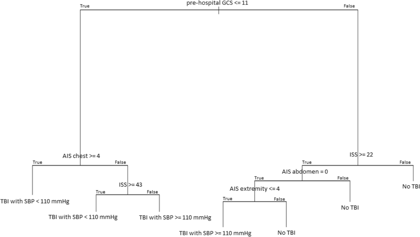 Classification tree to predict traumatic brain injury (TBI) with and without hypotension and no TBI. AIS, Abbreviated Injury Scale; GCS, Glasgow Coma Scale; ISS, Injury Severity Score; SBP, systolic blood pressure