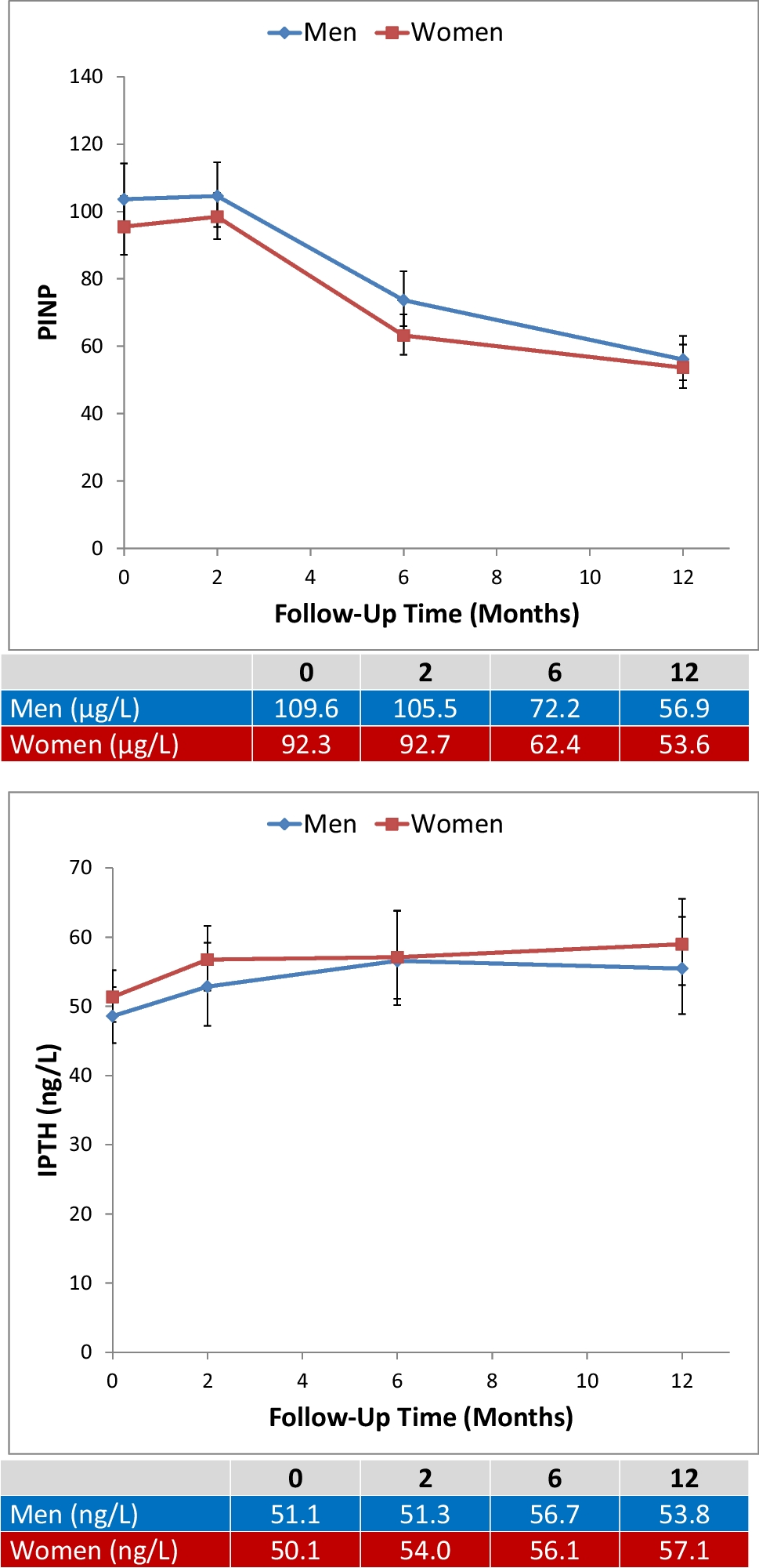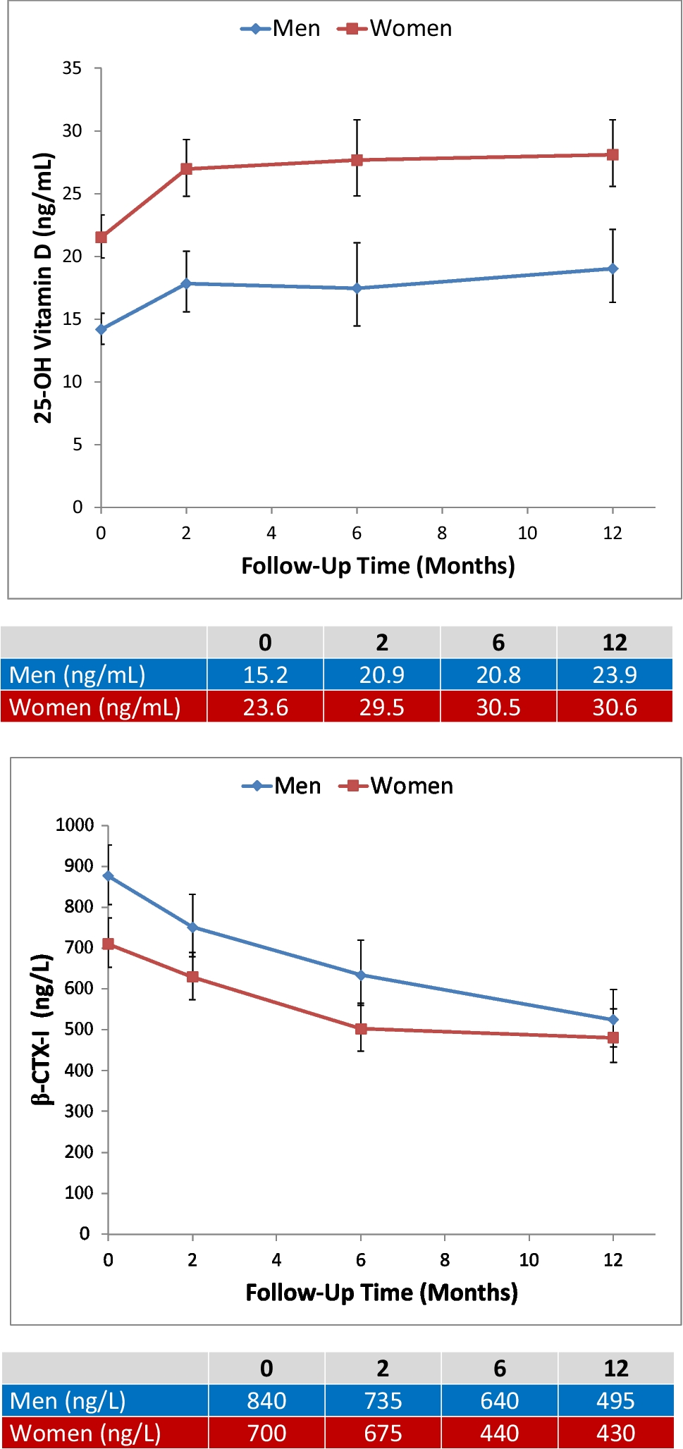 Community-dwelling, ambulatory adults aged 65 years and over (157 men and 154 women) enrolled in the Baltimore Hip Studies 7th cohort were included. We analyzed 25OHD, C-terminal telopeptide (β-CTX-I), procollagen type I N-terminal propeptide (PINP), PTH, and femoral neck BMD at baseline, 2, 6, and 12 months after hip fracture, and short physical performance battery (SPPB) at 2, 6, and 12 months.