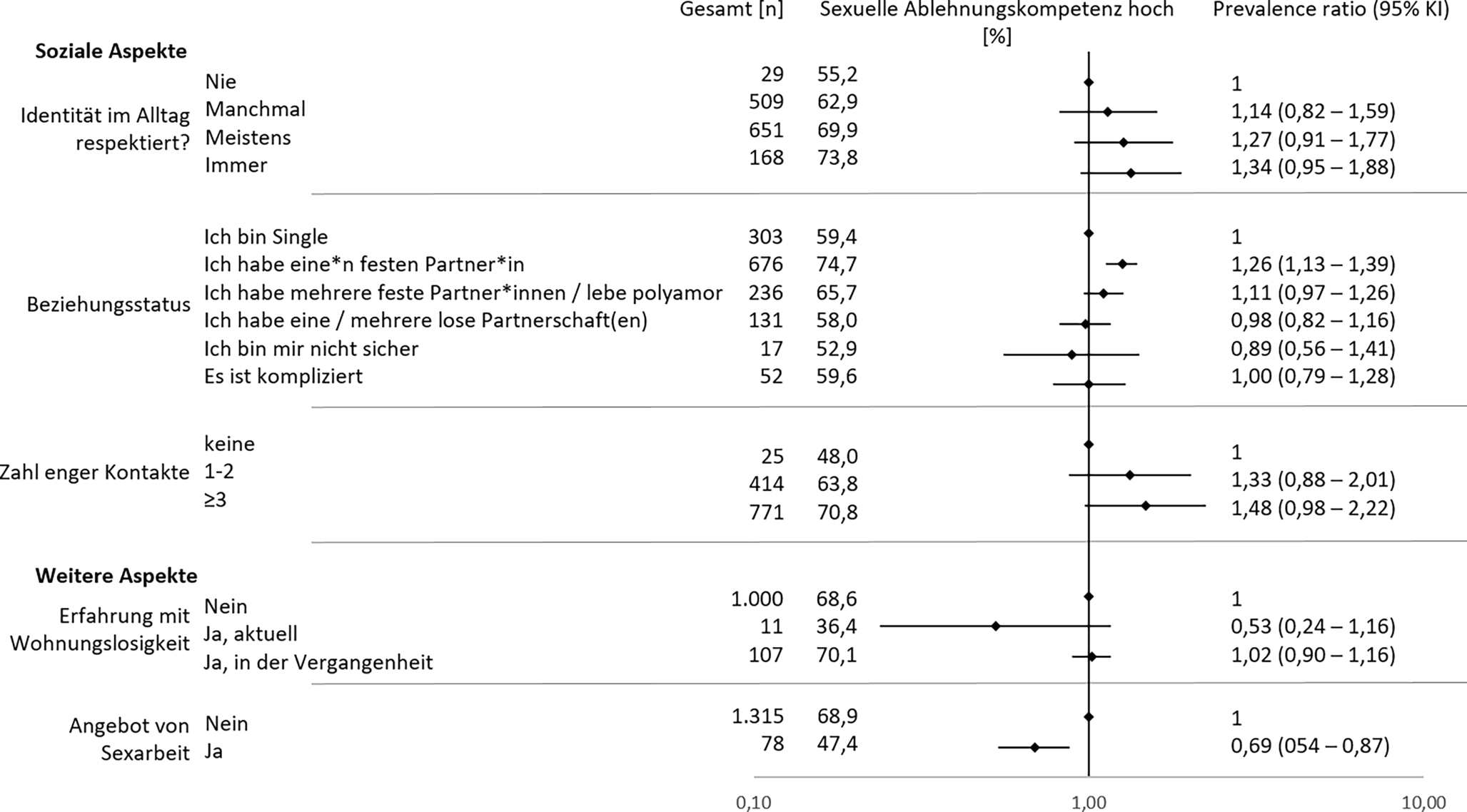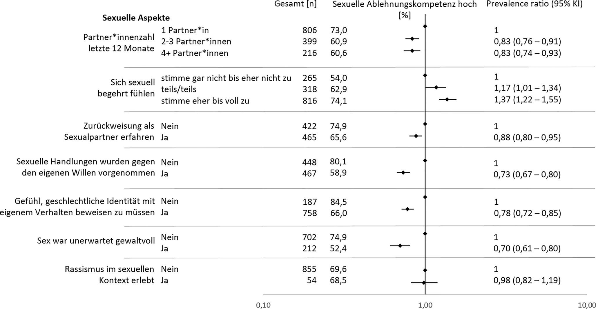 Sexuelle Ablehnungskompetenz (Zustimmung zur Frage: „Es fällt mir leicht, ‚Nein‘ zu Sex zu sagen, den ich nicht möchte“) | Stimme gar nicht zu | 56 (3,9 %) |