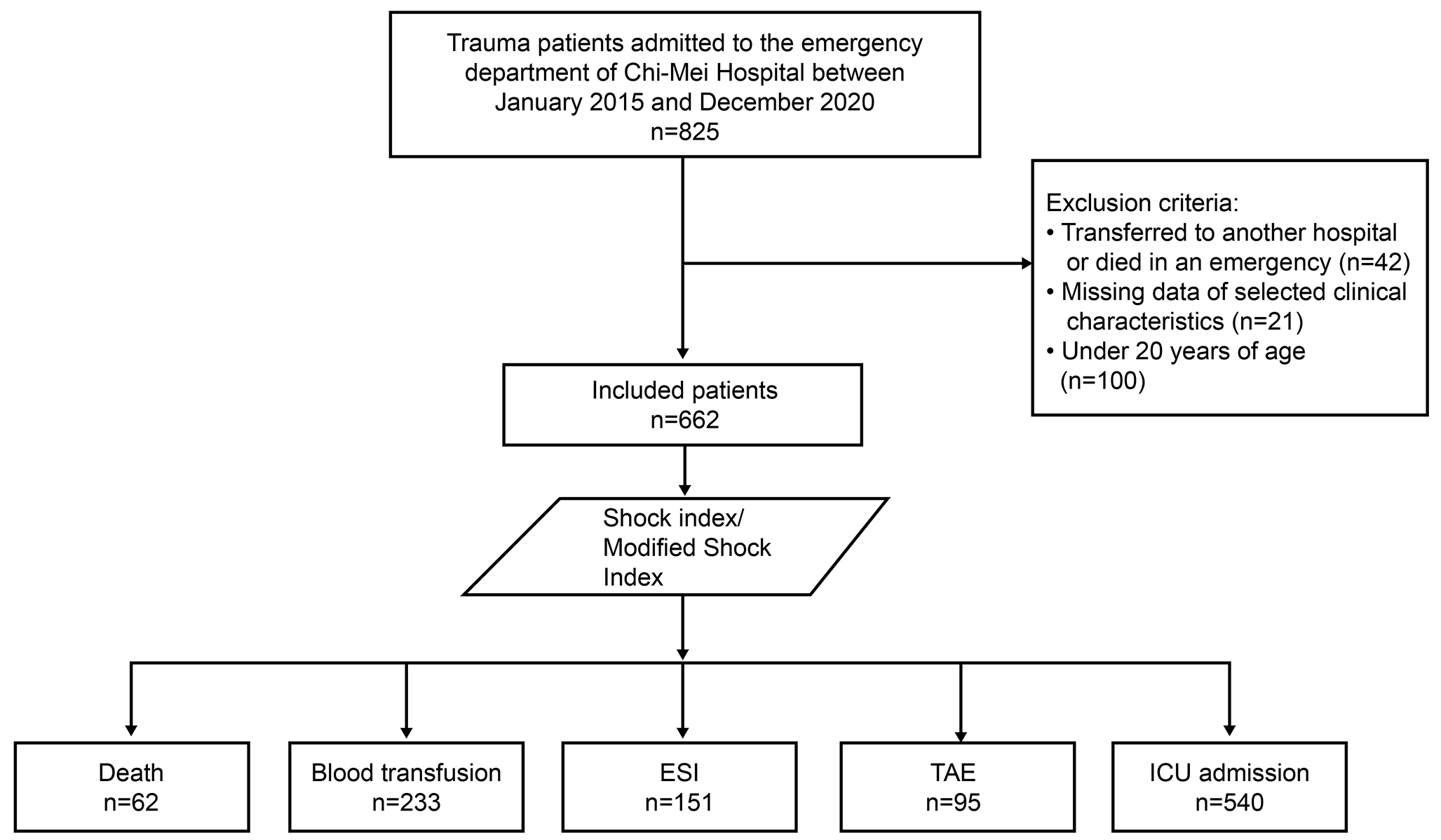 This retrospective cohort study was conducted at Chi Mei Hospital from January 2015 to December 2020. The comprehensive analysis included 662 patients, with data collected on vital signs and outcomes such as mortality, blood transfusion, emergent surgical intervention (ESI), transarterial embolization (TAE), and intensive care unit (ICU) admission. Optimal cutoff points for SI and MSI were identified by calculating the Youden index. Logistic regression analysis was used to assess outcomes, adjusting for demographic and injury severity variables.