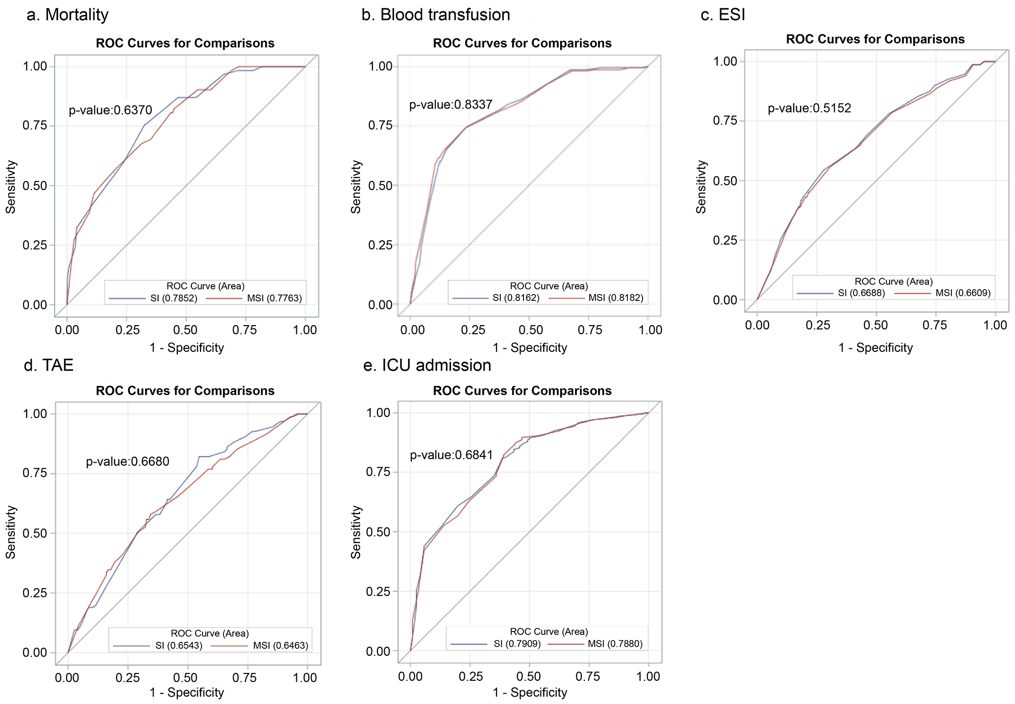 Comparison of the area under the ROC curve (AUROC) of SI and MSI for predicting mortality, blood transfusion, ESI, TAE, and ICU admission (Fig. 2) revealed that both SI and MSI showed high predictive power for mortality (AUROC = 0.7852 and 0.7763, respectively; P = 0.6370) and blood transfusion (AUROC = 0.8162 and 0.8182, respectively; P = 0.8337). Additionally, both SI and MSI showed lower, but acceptable, predictive power for TAE (AUROC = 0.6543 and 0.6436, respectively; P = 0.6680), ESI (AUROC = 0.6688 and 0.6609, respectively; P = 0.5152), and ICU admission (AUROC = 0.7909 and 0.7880, respectively; P = 0.6841). The predictive power did not differ between SI and MSI in any of the outcomes, including mortality, blood transfusion, ESI, TAE, and ICU admission.