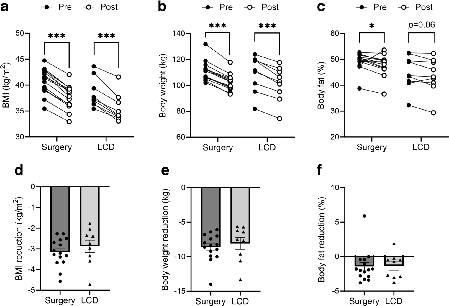 BMI, kg/m2 | 40.7±2.5 | 37.6±2.3*** | 38.4±2.8 | 35.5±2.7*** | 0.917 |