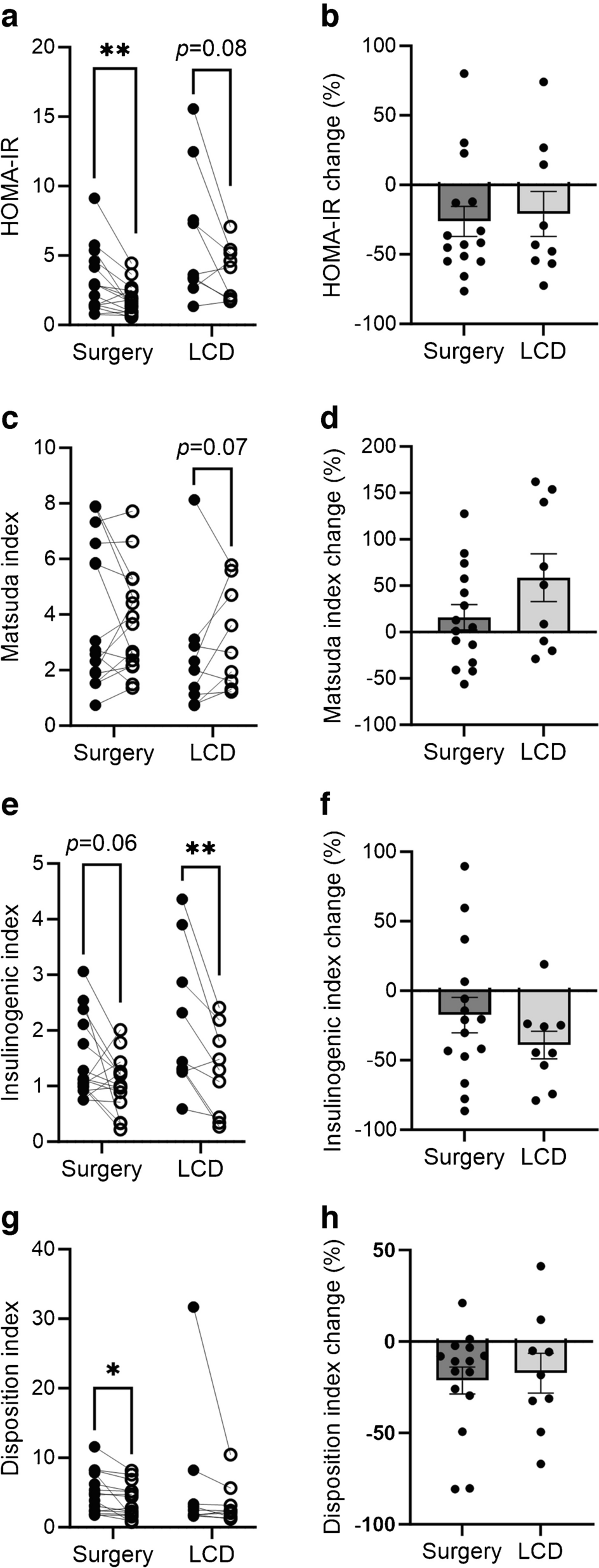 Insulinogenic indexc | 1.5±0.7 | 1.0±0.5 | 2.1±1.3 | 1.3±0.8** | 0.591 |