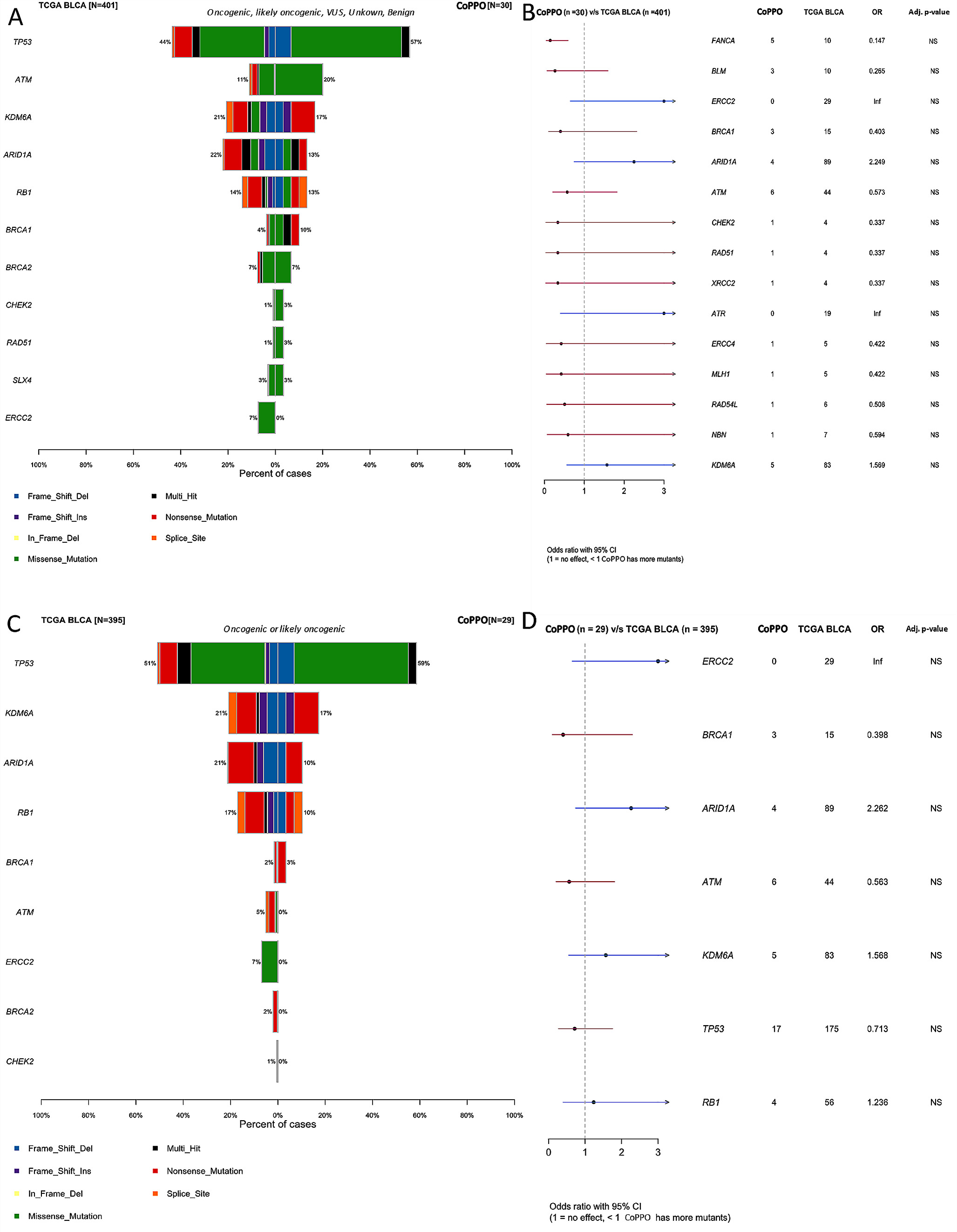 We used the Fisher exact test to assess the difference between distinct variables between the CoPPO and TCGA BLCA cohort; the Welch T-test was applied for continuous variables. Were stated, we corrected for multiple testing using the Benjamini-Hochberg (BH) procedure. Survival duration for the CoPPO cohort was defined as the time from initiating first-line therapy for metastatic disease and, secondly, from the time of inclusion in the CoPPO trial until death or censoring. Survival duration for the TCGA cohort was defined as the time from pathological diagnosis until death or censoring. Survival was assessed using Kaplan-Meyer, with a log-rank test to discern the statistical differences between the selected strata. All analyses were performed in R version 4.3.1 (R Core Team (2020).), and maftools v.2.18.0(Mayakonda et al. 2018) were used to visualize genomic data.