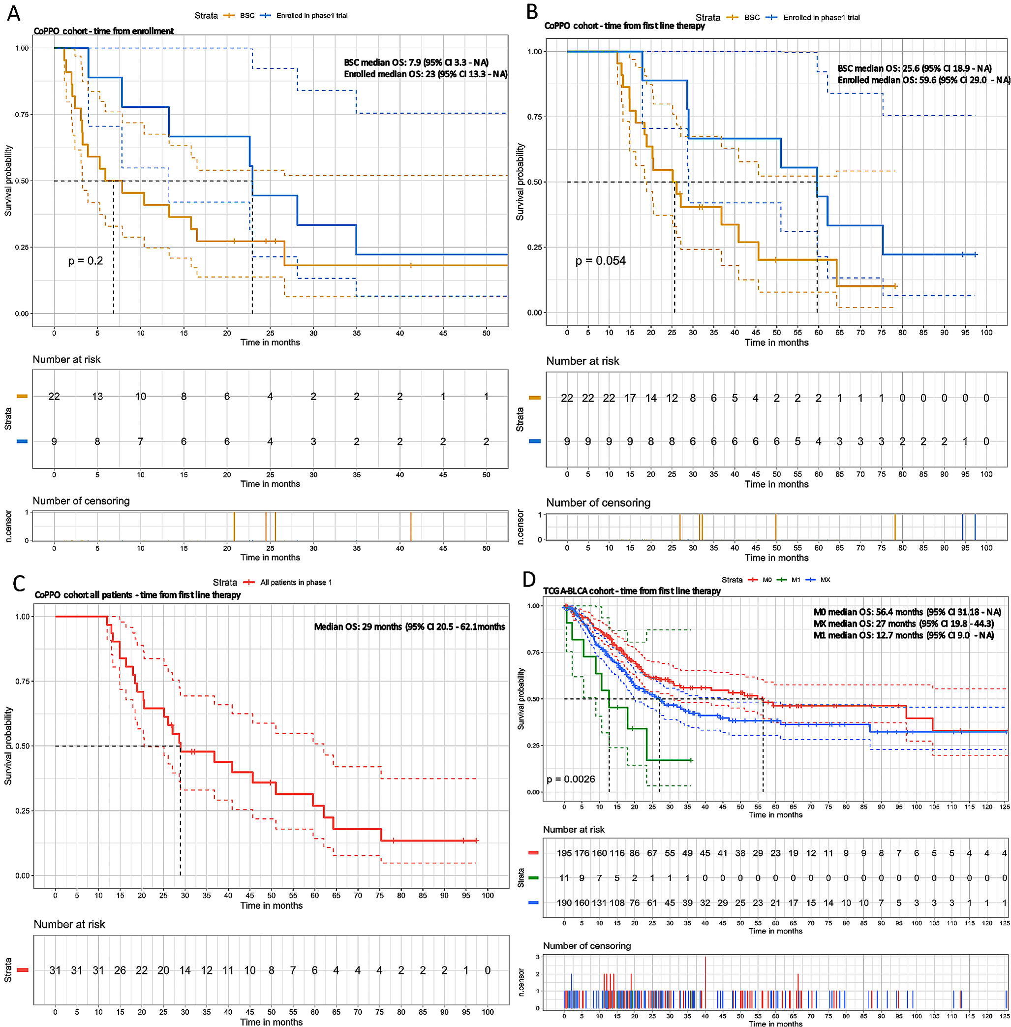 Survival curves of CoPPO cohort. A: From the time of enrollment in CoPPO. B: From the time of baseline first-line treatment. C: Survival of all patients referred to the CoPPO unit from first-line treatment. D: Survival of TCGA-BLCA cohort stratified by metastasis at baseline first-line treatment. M0: No metastatic disease at baseline, M1: Metastatic at baseline, MX: Metastasis cannot be measured