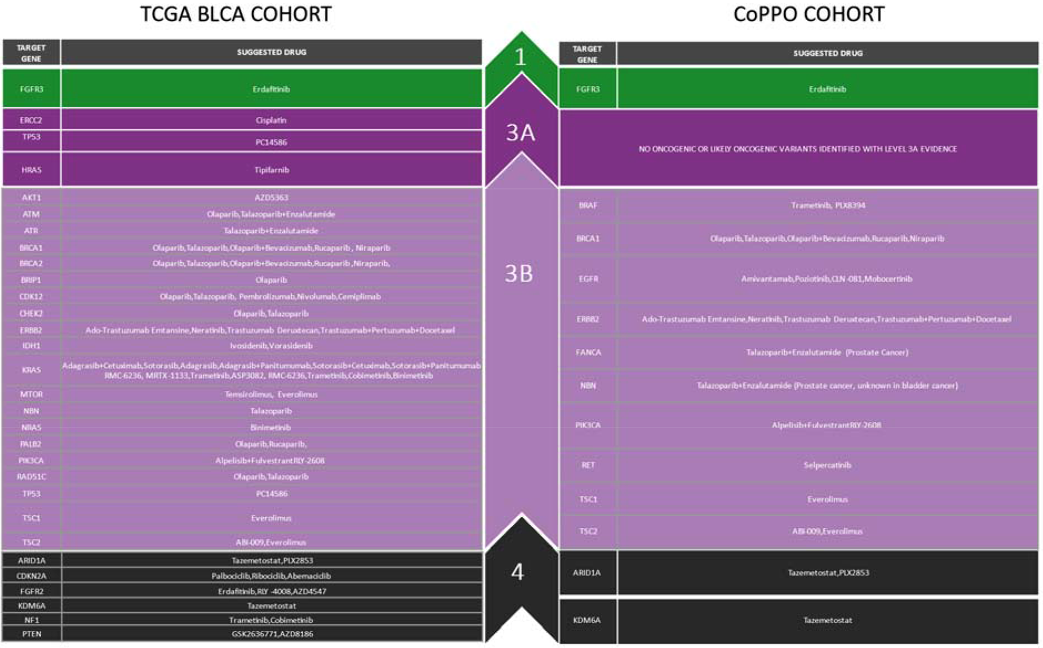 Figure 4 compiles the oncogenic or likely oncogenic variants where drugs targeting these genomic alterations are available for the TCGA BLCA and CoPPO cohorts. These include kinase inhibitors, DNA-damage response modulators, CDK inhibitors, mTOR inhibitors, and IDH inhibitors, as detailed in Fig. 4 and Tables S1 and S4. Four patients in our cohort received targeted therapy (Table S2) directed at mutations in ERBB2 or FGFR3, and five patients received non-targeted treatment; no survival difference between targeted and non-targeted therapy was observed (Figure S4), although small patient numbers limit this interpretation.