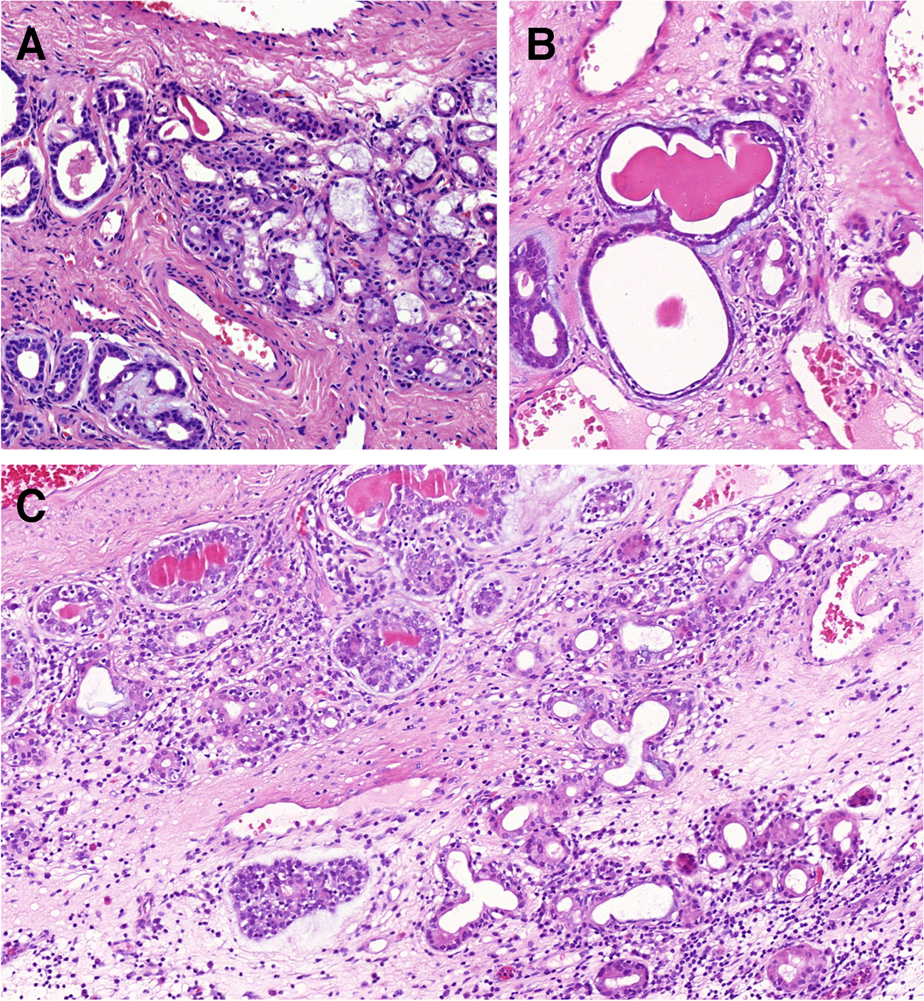 Although it has been generally accepted that sinonasal AdCCs probably originate from seromucinous glands, their histogenesis and their putative precursor lesions, if any, have never been verified. The role of background mucosa or glands in the development of sinonasal AdCC, particularly the presence of atypical or dysplastic features, has received little attention in surgical pathology reports and the literature.
