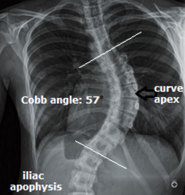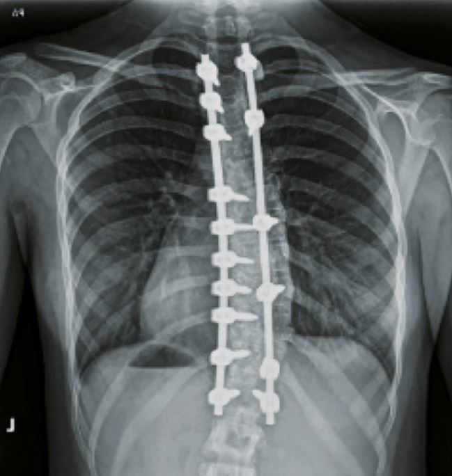 Eine Teenagerin hatte seit einem halben Jahr eine zunehmende Vorwölbung der rechten Scapula, einen Schiefstand der linken Schulter und eine Prominenz der linken Hüfte bemerkt (Abb. 1). Wegen der Veränderungen passte sogar ihre Kleidung nicht mehr richtig. Sie hatte keine Schmerzen oder Bewegungsstörungen. Die Röntgenaufnahme zeigte eine hochgradige Skoliose.