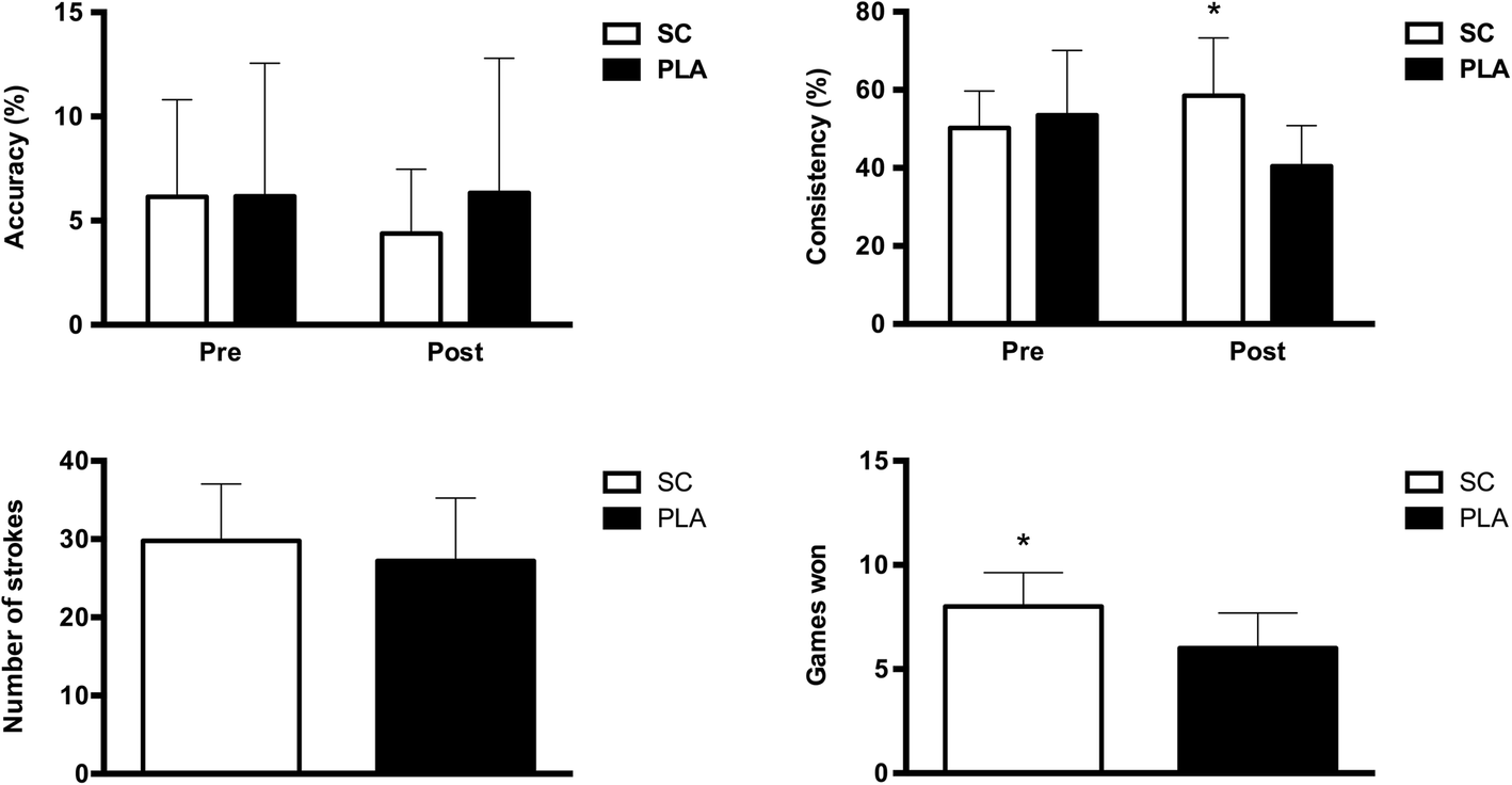 In conclusion, SC supplementation (0.5 g.kg−1BM in capsules of 500 mg) significantly altered metabolic parameters (i.e. BE, pH, HCO3−, [La]) and improved skilled tennis performance (i.e. percent shot consistency and games won during simulated match play) compared to PLA. Importantly, no players reported any significant GI discomfort following SC supplementation. Practically, it appears that SC supplementation can be safely and effectively utilized in tennis players to enhanced skilled performance. Although, it cannot be known from these results if SC supplementation would be beneficial in long lasting matches, previous data has shown SC to be effective for up to 30 km of cycling, thus it is possible that SC could be beneficial in matches lasting for multiple hours. Importantly, if SC is utilized in training sessions, training volume could be increased to allow for greater duration of quality skill practice. Additionally, it should be noted that individual athletes may have varying GI responses to SC, even though no athletes reported discomfort in the present study, thus future studies should continue to investigate the efficacy/safety of SC supplementation in various athletic populations.