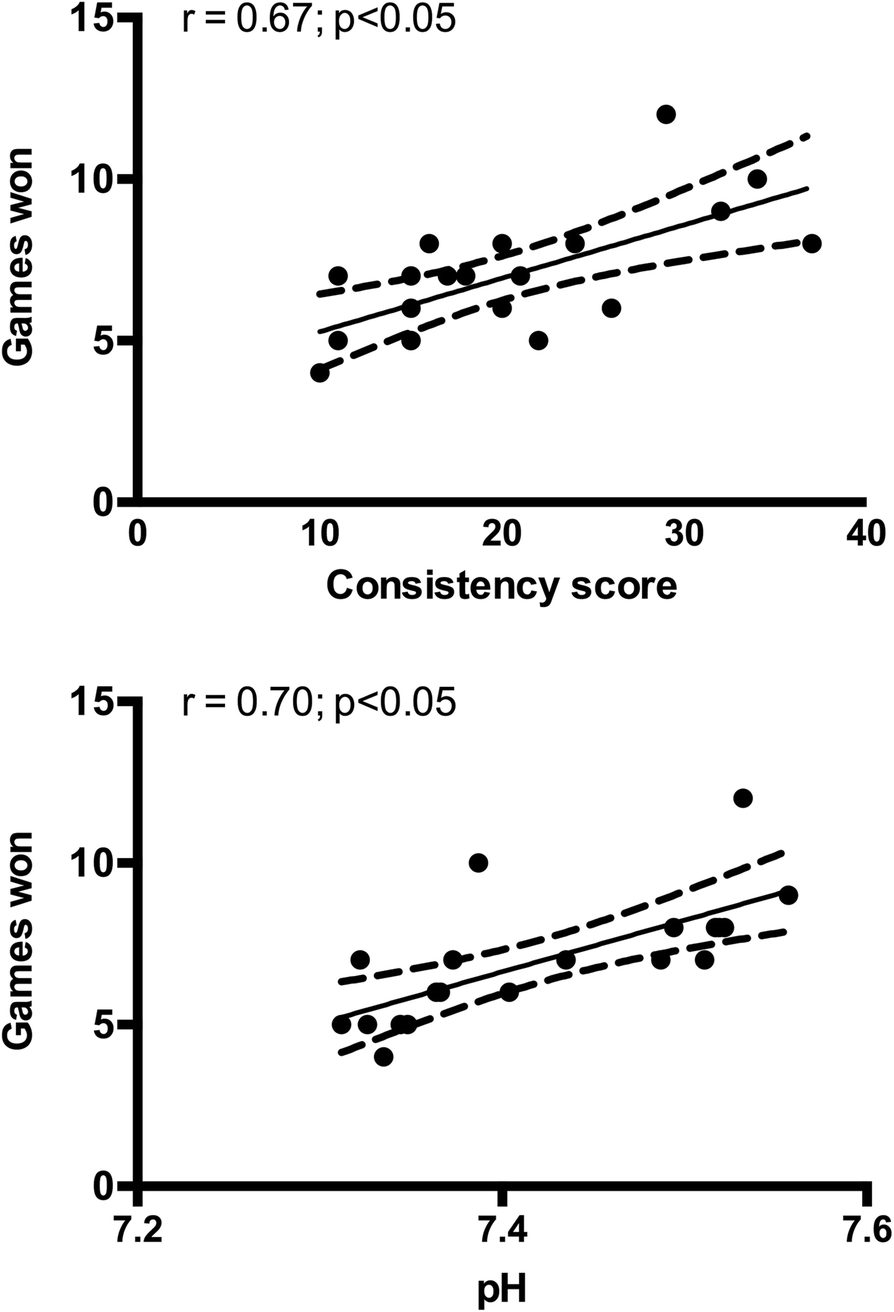 18]. Presently, it was observed [La] concentration in SC to reach 5.46 ± 1.11 mM at post-match, which is lower than the upper end previously observed, however, the only 1-h of match time in the present study likely accounts for this lower level. Although a relationship between acidity and mistimed strokes was not observed presently, a positive relationship between pH and games won (r = 0.70) was observed suggesting that inducing alkalosis may enhance tennis performance.