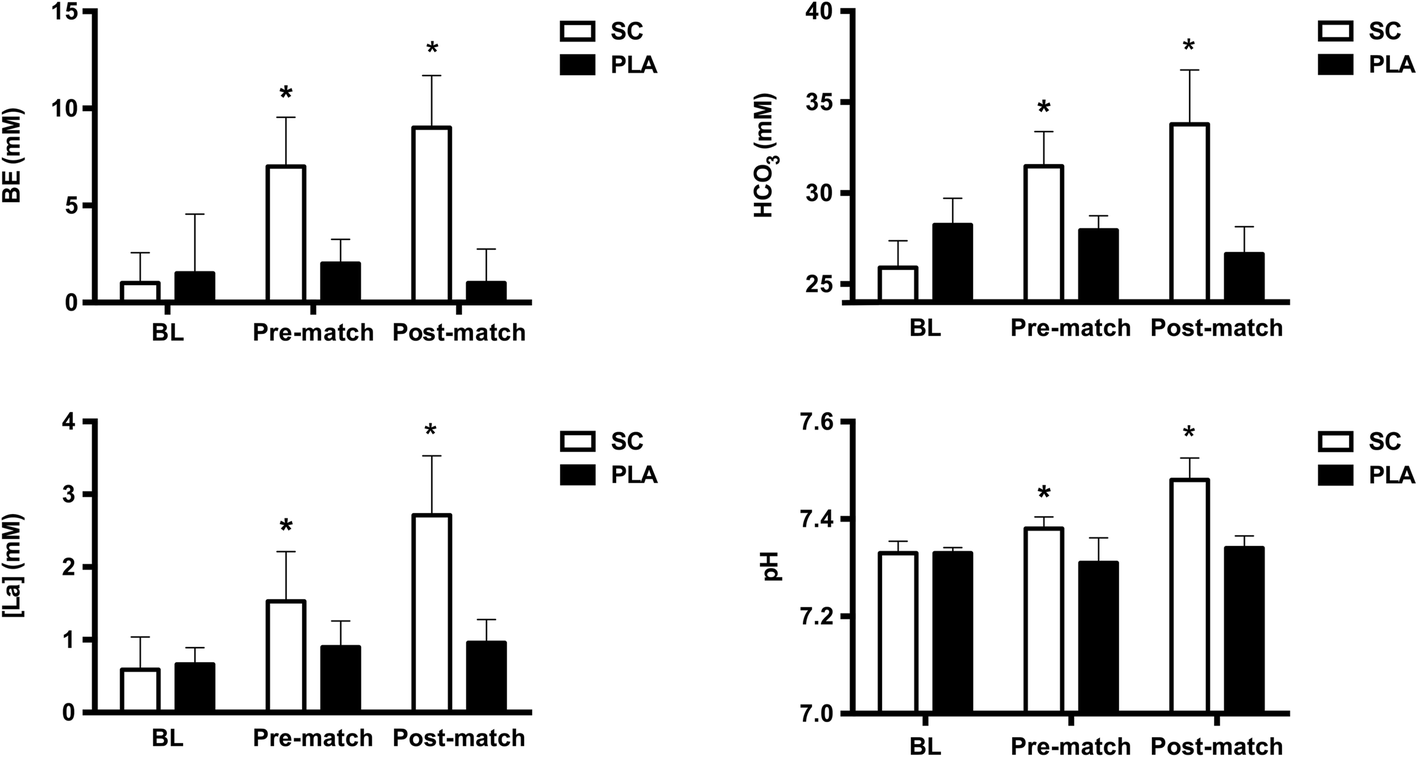 3−, and [La] in the players at post-match in SC compared to the PLA condition. Interestingly, the increase in [La] in SC occurred despite an increase in pH. However, a concomitant increase [La] and extracellular pH is in agreement with previous findings in which alkalosis has been induced [