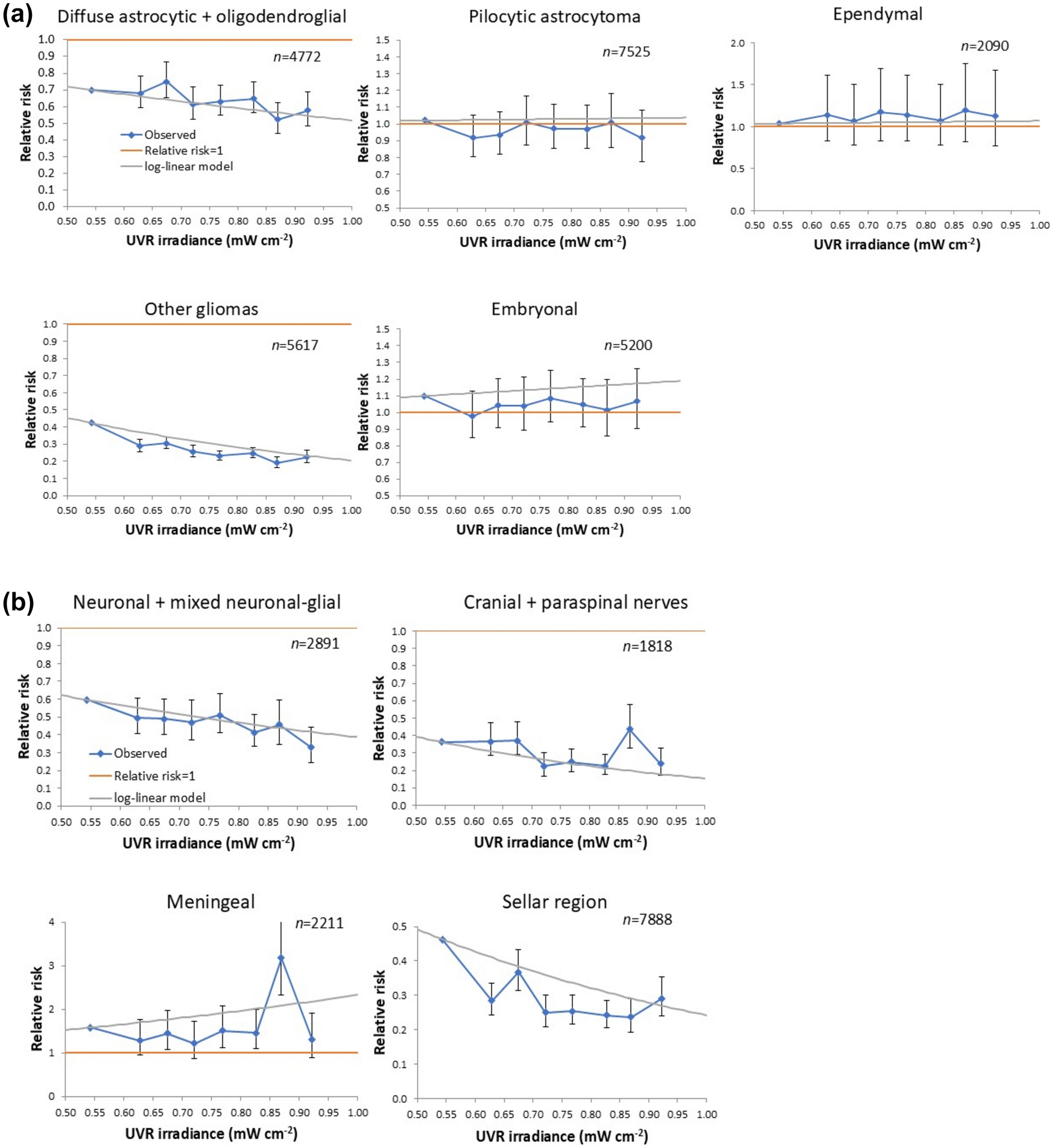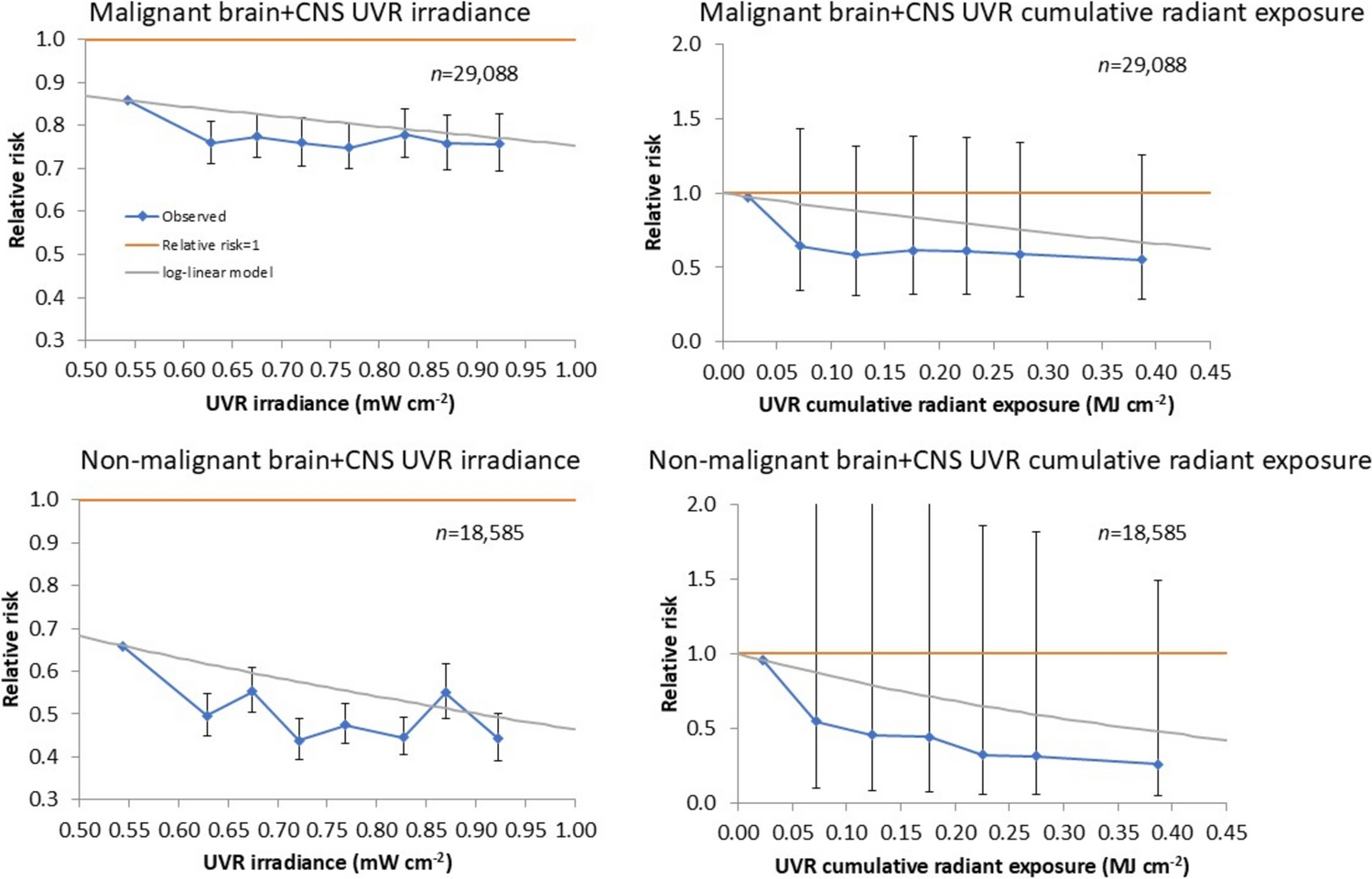A meta-analysis of 75 cancer registries suggested an increase of childhood brain and spinal neoplasm incidence with increasing latitude, consistent with a protective effect of solar UVR exposure [11]. However, a case–control study of early childhood (ages 0–5) cancers nested within the California cancer registry, and using ground based assessments of UVR exposure, suggested a small increase in intracranial/intraspinal embryonal tumours (n = 550 cases) among those with highest level of UVR exposure, although there was no relation with UVR exposure for other intracranial and intraspinal tumours [12]. An ecological Spanish study found that all-age brain cancer mortality was inversely correlated with mortality from non-melanoma skin cancer [13], implying (since non-melanoma skin cancer is consistently associated with long-term UVR exposure) that brain cancer mortality may be inversely related to UVR exposure. It is biologically not implausible that UVR could be protective, via augmentation of production of vitamin D [14].