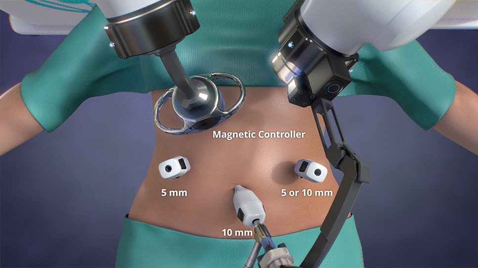 A number of minimally invasive techniques have been introduced since the advent of laparoscopy with the goal of reducing postoperative pain and improving cosmesis, including magnetic-assisted surgery [7]. The concept of magnetic surgery involves deploying a magnetic instrument into the peritoneal cavity that is then manipulated by the surgeon using a magnet placed externally onto the abdominal wall, thus eliminating a laparoscopic port. The first magnetic system to receive Food and Drug Administration (FDA) approval was the Levita® Magnetic Surgical System (Levita Magnetics, Mountain View, CA), which has proven safety and efficacy in laparoscopic cholecystectomy, bariatrics, urology, and colorectal surgery [8‐10]. The magnetic-assisted robotic surgery (MARS®) platform was subsequently developed by Levita, composed of two robotic arms that enable control of an external magnet and laparoscopic camera by the operating surgeon. In a recent series of minimally invasive urologic procedures, the MARS platform was particularly useful for tissue retraction, avoiding additional incisions, and reducing the need for a surgical assistant [11].