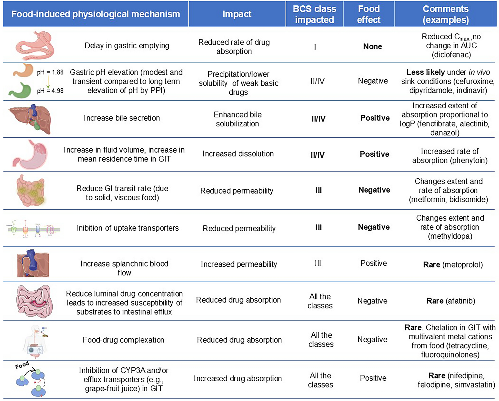 Impact of food-induced physiological mechanisms for BCS drugs. BCS biopharmaceutical classification system; PPI proton pump inhibitor; GI gastrointestinal; GIT gastrointestinal tract. In column 1, change “Reduce luminal drug concentration leads to increase susceptibility of substrates to intestinal efflux” to “Reduced luminal drug concentration leads to increased susceptibility of substrates to intestinal efflux”. In column 5 change “Increase extent of adsorption proportional to logP (fenofibrate, alectinib, danazol)” to “Increased extent of adsorption proportional to logP (fenofibrate, alectinib, danazol)”. In column 5, change “Increase rate of adsorption (phenytoin)” to “Increased rate of adsorption (phenytoin)”