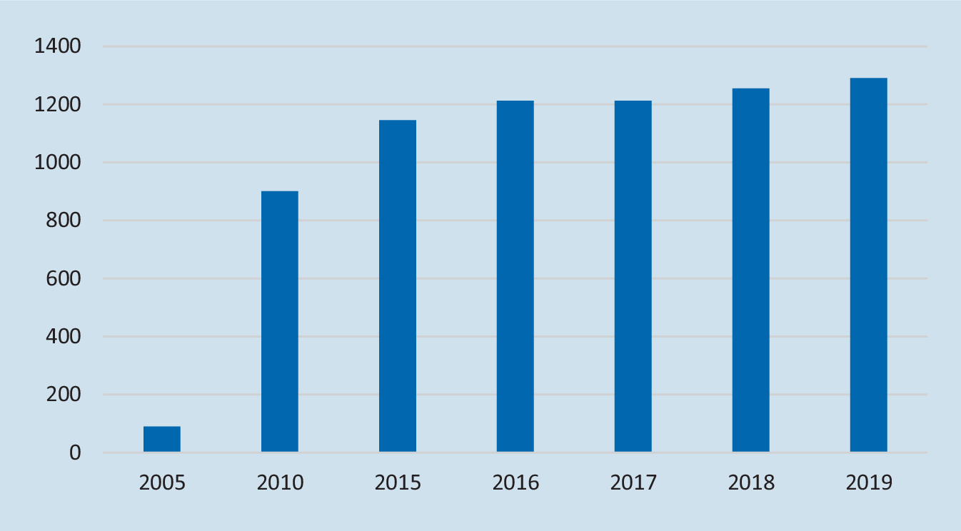 Das Informationssystem der Gesundheitsberichterstattung des Bundes [2] weist für 2018 eine Gesamtzahl von 1255 Schlafmedizinerinnen in Deutschland aus. Die zeitliche Entwicklung der Zahl der Schlafmedizinerinnen kann der Abb. 1 entnommen werden. Hierbei zeigt sich, dass nach der Einführung der Zusatzbezeichnung zwischen 2005 und 2015 zwar eine rasche Zunahme der Anzahl zu verzeichnen ist, die Zahl allerdings seitdem weitgehend stagniert.