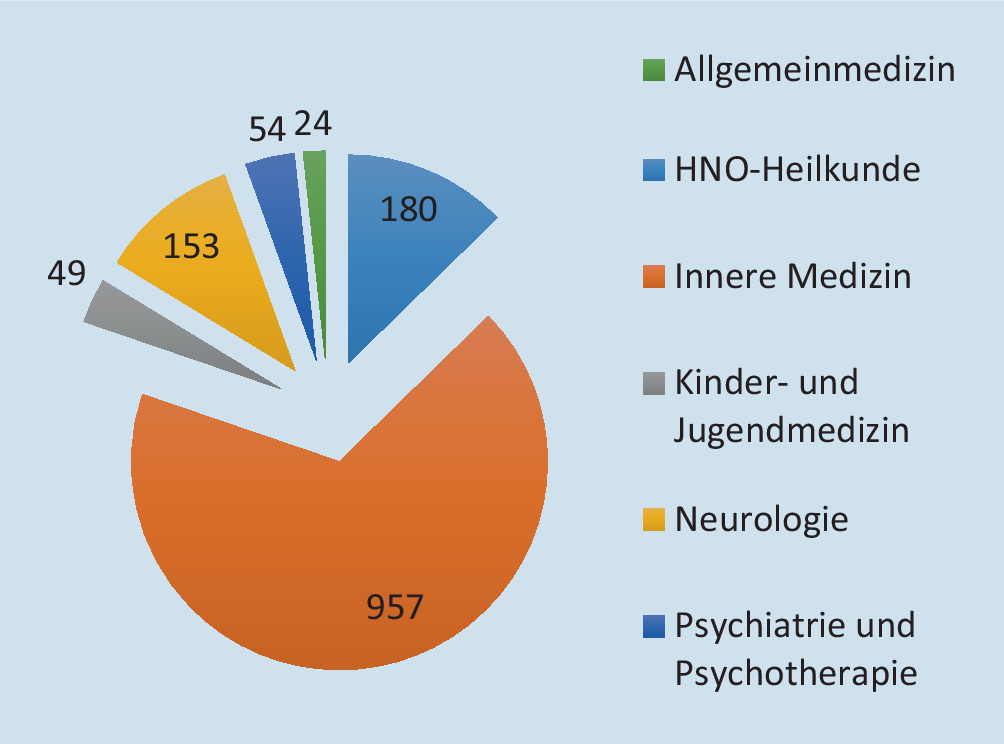 Eine Aufgliederung nach Fachdisziplinen ist anhand dieser Daten jedoch nicht möglich. Zur Erfassung der Anzahl der Schlafmedizinerinnen in Deutschland im Allgemeinen und bezogen auf die Bundesländer erfolgte daher eine Abfrage bei den Landesärztekammern im Dezember 2020, wobei alle Landesärztekammern entsprechende Daten bereitgestellt hatten. Nach den zur Verfügung gestellten Daten waren 1436 Schlafmedizinerinnen in Deutschland verzeichnet. Die Zahl der berufstätigen Ärztinnen in Deutschland im Jahr 2019 lag bei 402.119 [3]. Demnach verfügen nur etwa 0,4 % aller berufstätigen Ärztinnen über eine Zusatzbezeichnung Schlafmedizin. Betrachtet man nur die Fachärztinnen, die eine solche Zusatzbezeichnung erwerben können (s. oben), so liegt die Zahl bei 1436/142.779, entsprechend also bei 1,0 %, wobei die Fachärztinnen für Mund‑, Kiefer- und Gesichtschirurgie hier nicht einberechnet wurden, da diese in der genannten Statistik des statistischen Bundesamtes nicht aufgeführt sind.