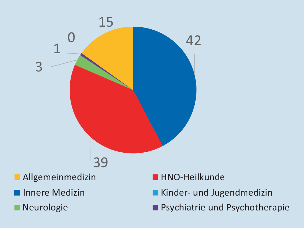 Die Abb. 3 zeigt die Verteilung der Fachärztinnen mit der Zulassung zur ambulanten Polygrafie nach Fachgruppen in Prozent. Ca. 80 % der Fachärztinnen mit Zulassung entstammen den beiden Disziplinen Innere Medizin und HNO-Heilkunde, mit nahezu identischen prozentualen Anteilen. Der Anteil der Allgemeinmedizinerinnen mit 15 % geht vornehmlich auf eine außergewöhnlich große Anzahl an Allgemeinmedizinerinnen mit entsprechender Zulassung im Bereich der Kassenärztlichen Vereinigung Nordrhein zurück, während er in allen anderen Kassenärztlichen Vereinigungen kaum eine Rolle spielt. Obwohl Fachärztinnen für HNO-Heilkunde zahlenmäßig zur kleinsten Gruppe der Fachärztinnen zählen, die eine Zulassung erwerben können, stellen sie fast 40 % der Fachärztinnen mit Zulassung zur Polygrafie. Die Anzahl der durchgeführten Untersuchungen kann hieraus allerdings nicht abgeleitet werden.