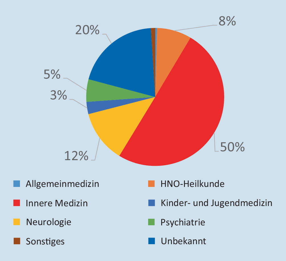 Nach den Informationen der Geschäftsstelle der DGSM (Stand Oktober 2020) existieren in Deutschland 700 ärztliche Somnologinnen. Dies entspricht 700/402.118 (0,17 %) aller berufstätigen Ärztinnen [3], wobei nicht alle gelisteten Somnologinnen noch berufstätig sind, was den prozentualen Wert nochmals reduziert. Der Anteil der verschiedenen Berufsgruppen in Bezug auf die Gesamtzahl der Somnologinnen ergibt sich aus Abb. 4. Die weit überwiegende Zahl der Somnologinnen sind Internistinnen.