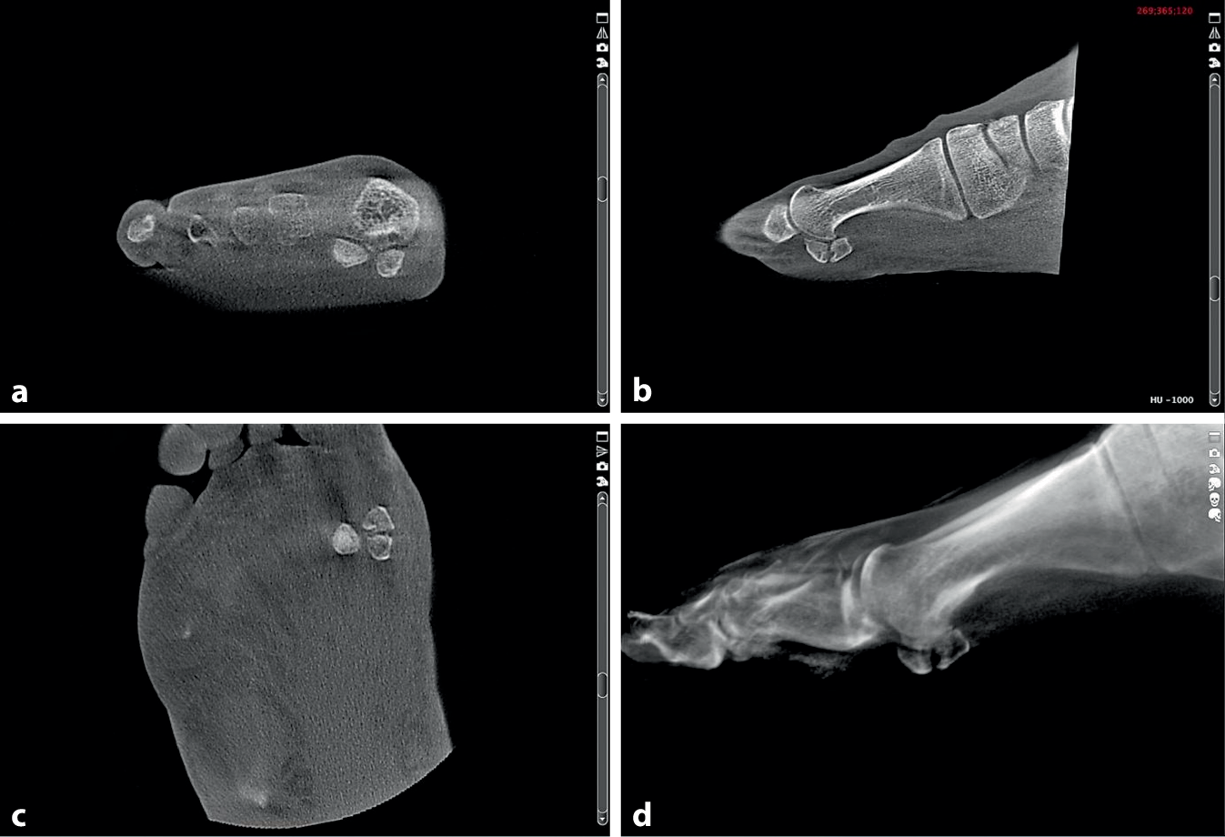 Weight-bearing-CT (WBCT) als digitale Volumentomographie im Stehen einer medialen Sesambeinfraktur in drei Ebenen (a-c) sowie in der dreidimensionalen Reformation (d)