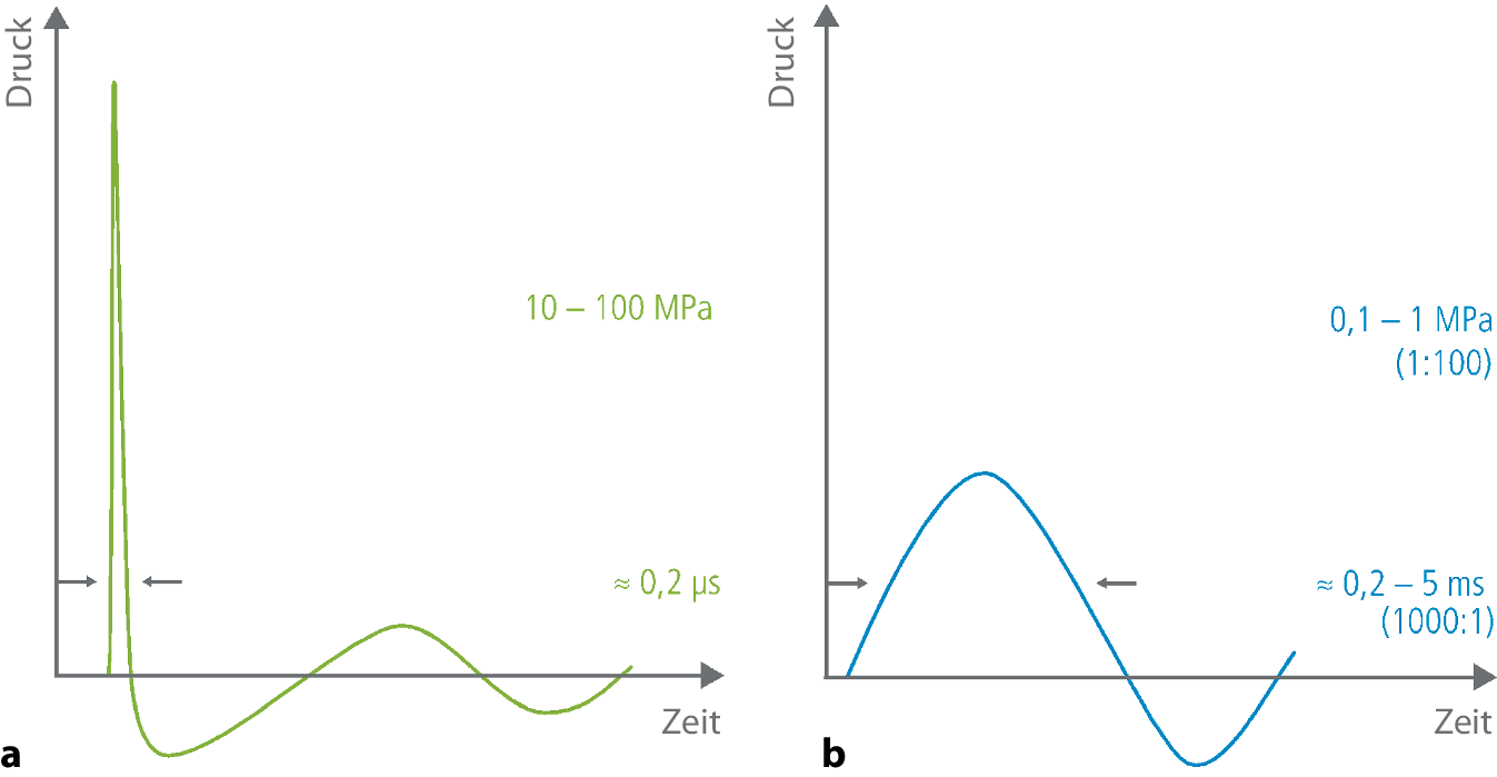 Prinzipiell ist die radiale, ballistische Druckwellentherapie von der fokussierten Stoßwellentherapie zu unterscheiden. Die Druckanstiegsanstiegsgeschwindigkeit der fokussierten Stoßwelle ist um ein Vielfaches schneller und höher als die der radialen Druckwelle (Abb. 2).