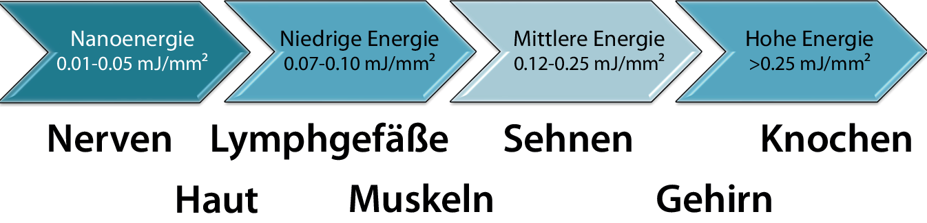 Die Entwicklung der fokussierten ESWT durch mehrere Unternehmen mit den drei genannten Generatortypen in den 1980er- und 1990er-Jahren führte zu einer Vielzahl an auch physikalischen Konsensuskonferenzen. Als ein Parameter, der die fokussierte ESWT beschreibt, wurde die Energieflussdichte gemessen in mJ/mm2 eingeführt. Nierensteinzertrümmerung wird in der Regel hochenergetisch mit 1,0–2,5 mJ/mm2 durchgeführt, während die orthopädisch-regenerative Behandlung an Sehnen zwischen 0,07 und 0,20 mJ/mm2, an Nerven wie dem N. medianus beim Karpaltunnelsyndrom sogar noch niedriger nanoenergetisch mit 0,01–0,05 mJ/mm2 erfolgt (Abb. 3).