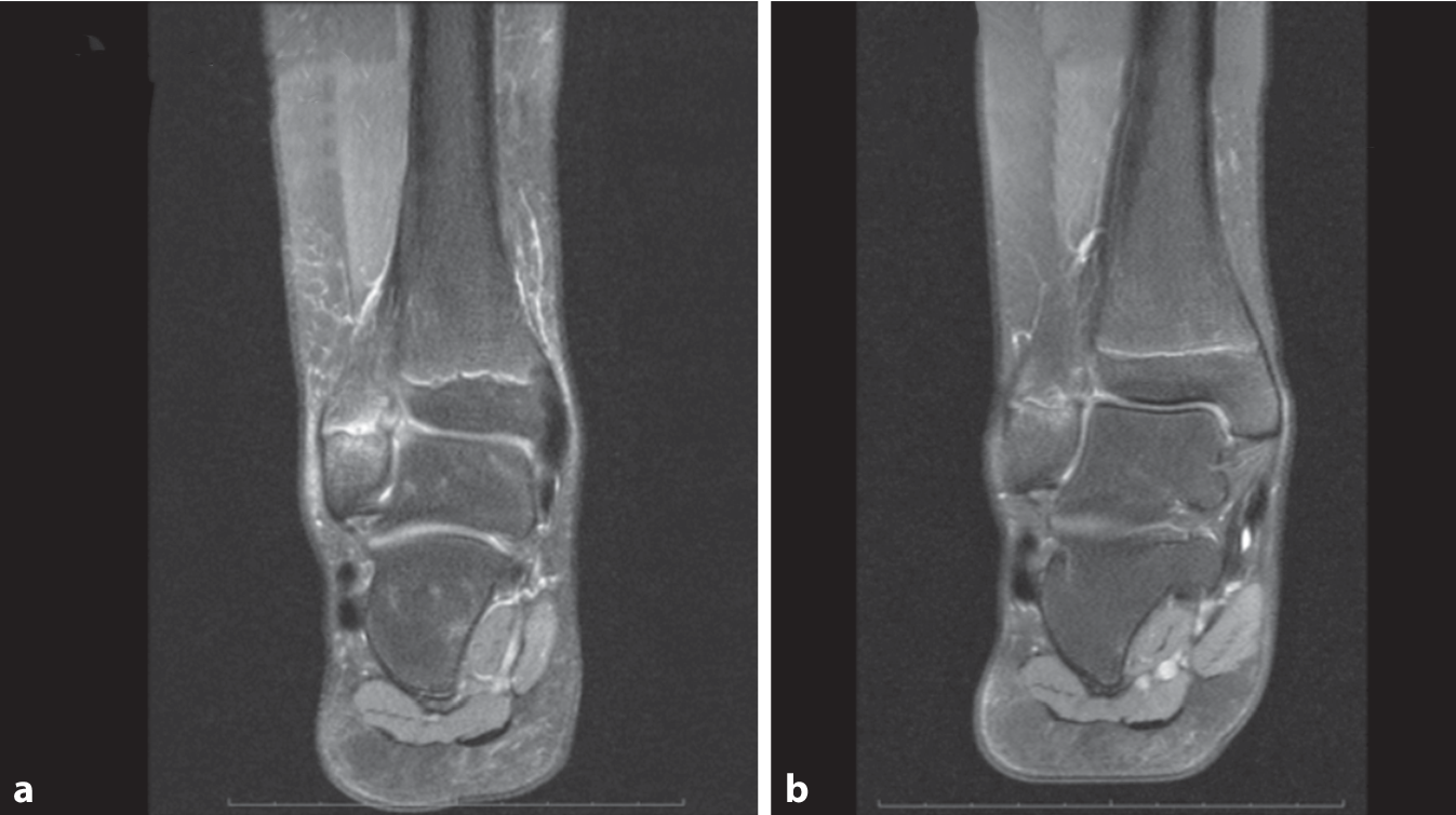 Knochenödem der distalen Fibula (rechte Seite, seit 2 Jahren bestehende Schmerzen im Außenknöchel) bei einer 11-jährigen Hockeyspielerin vor (a) und 5 Monate nach (b) 3 Sitzungen fokussierter Stoßwellentherapie (ESWT) ohne Zeichen eines vorzeitigen Epiphysenfugenschlusses