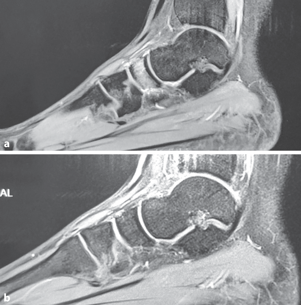 Stressfraktur des Os cuboideum mediale vor (a) und 6 Wochen nach (b) 3 Sitzungen kombinierter extrakorporaler Stoßwellentherapie (ESWT) und extrakorporaler Magnetotransduktionstherapie (EMTT) bei einer 15 Jahre jungen Hürdensprinterin