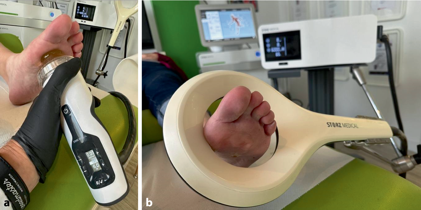 Eine randomisiert-kontrollierte Studie [26] bei spanischen Fußballspielern zeigte bei einer Stressfraktur des Metatarsale 5 für die fokussierte ESWT (0,21 mJ/mm2, 2000 Impulse, 3 Sitzungen) identische Ergebnisse im Vergleich zur operativen Schraubenversorgung in Bezug auf Schmerzreduktion und Return-to-Play.
