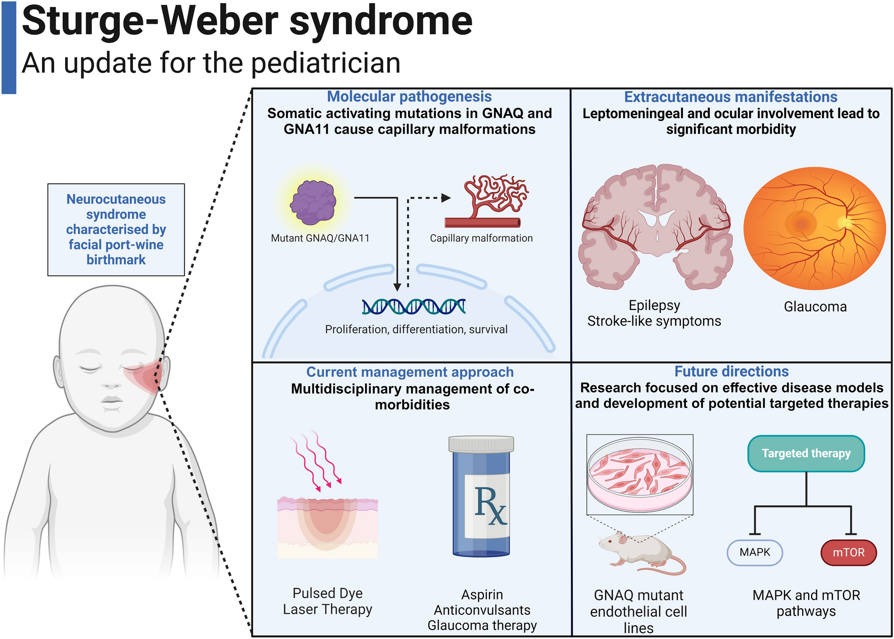 Sturge–Weber syndrome (SWS) is a rare congenital neurocutaneous disorder characterized by the simultaneous presence of both cutaneous and extracutaneous capillary malformations. SWS usually presents as a facial port-wine birthmark, with a varying presence of leptomeningeal capillary malformations and ocular vascular abnormalities. The latter may lead to significant neurological and ocular morbidity such as epilepsy and glaucoma. SWS is most often caused by a somatic mutation involving the G protein subunit alpha Q or G protein subunit alpha 11 gene causing various alterations in downstream signaling pathways. We specifically conducted a comprehensive review focusing on the current knowledge of clinical practices, the latest pathophysiological insights, and the potential novel therapeutic avenues they provide.