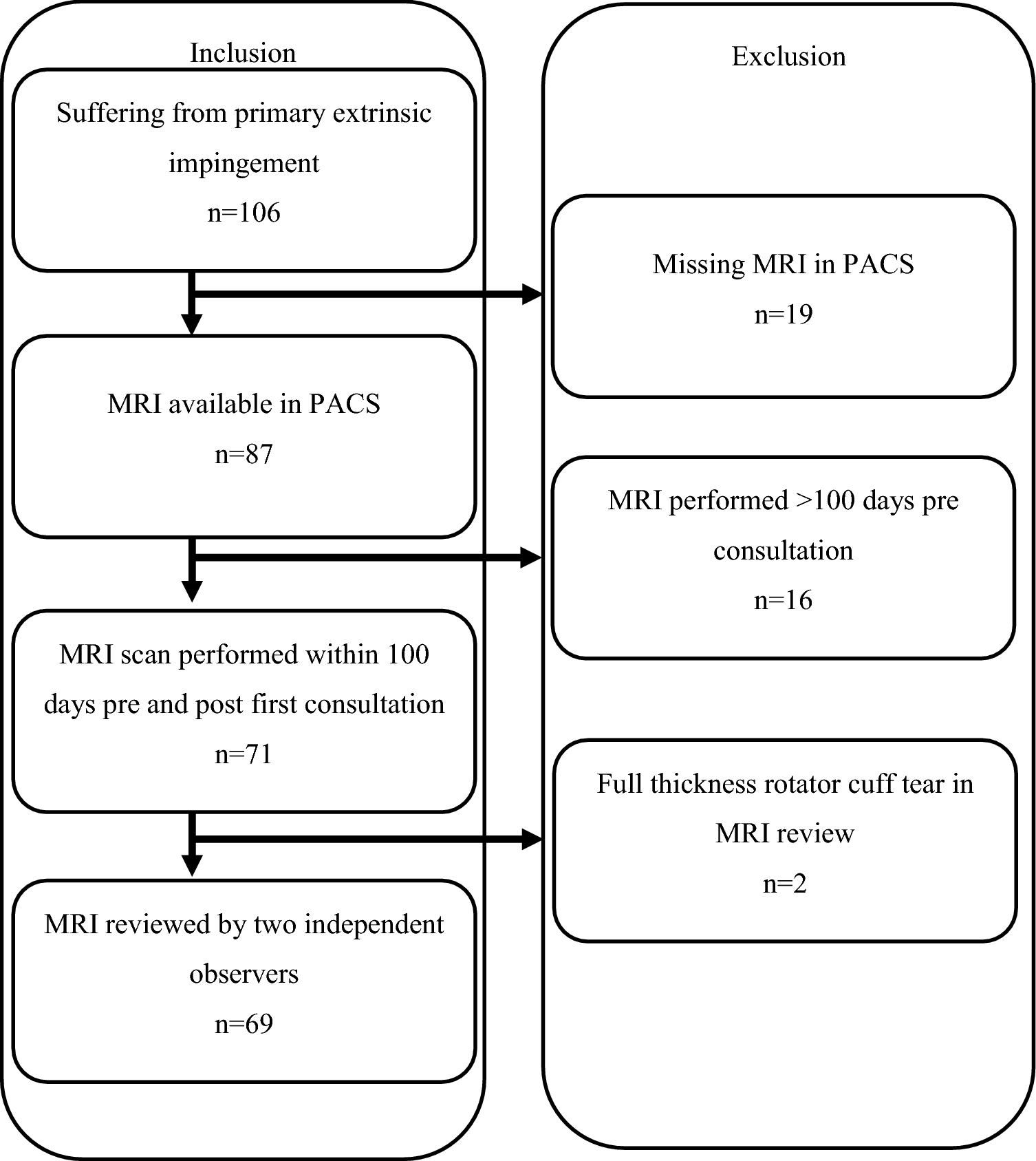 Exclusion criteria were presence of a rheumatic disease, symptomatic osteoarthritis of the shoulder, shoulder instability, pathologies of the tendon of the long head of the biceps, injuries to the glenoid and partial tears greater than 3 mm as well as full thickness tears of the rotator cuff. Figure 1 shows the sequence of inclusion. In 16 patients the MRI scan was older than 100 days at the start of our study. These patients were excluded from further analysis. During evaluation of these data we observed two patients with full thickness tears of the rotator cuff. Accordingly, 69 patients were considered in the final analysis.