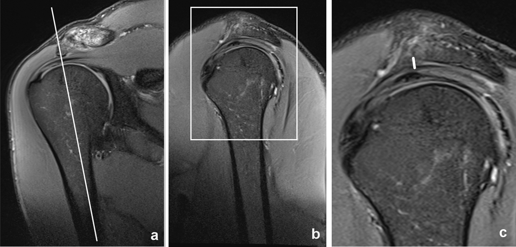 Measurement of a subacromial spur. Proton-density weighted fat saturated images in a coronal a and sagittal b, c plane. The size of the subacromial spur was measured in a sagittal plane according to the axis of the humeral head, the measured length is represented by a white line in c. The rectangle in b represents the area which is enlarged in c. The white line in a shows the imaging plane of the sagittal images b, c