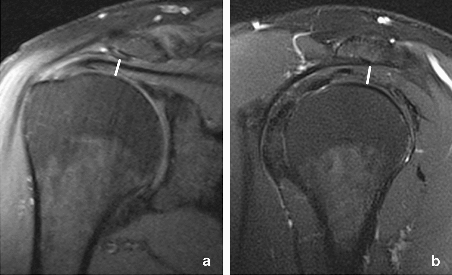 In a metanalysis, including 18 studies, McCreesh et al. showed that MRI (as well as CT) provide more reliable measurements of the acromiohumeral distance than conventional radiographs [28]. This meta-analysis also included a study by Saupe et al. that demonstrated significant correlation between tendon tears and fatty muscle degeneration with reduced acromiohumeral distance [29]. Saupe et al. also showed high interrater reliability for evaluation of the acromiohumeral distance (0.97–0.99) which was measured in sagittal plane [29]. In our study interrater reliability for measuring the evaluation of the acromiohumeral distance was also very good supporting the hypothesis that MRI provides reliable measurement of the acromiohumeral distance.