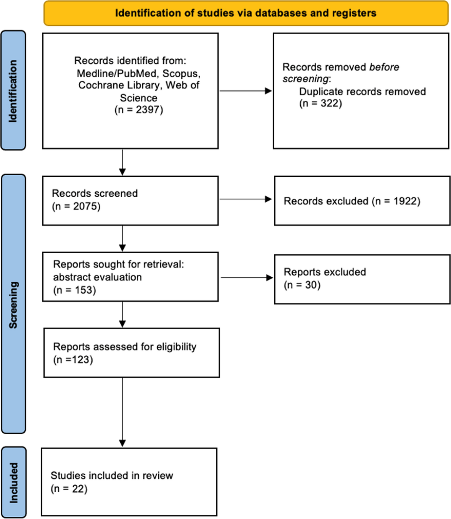 The literature search retrieved 2397 results, of which 322 were duplicates and excluded from the analysis. One thousand nine hundred twenty-two articles were excluded after title review. The abstracts of the remaining 153 articles were analysed and other 30 studies were excluded. Twenty-two studies were included in the final analysis (Fig. 1).