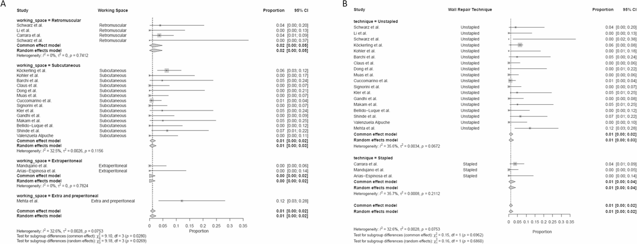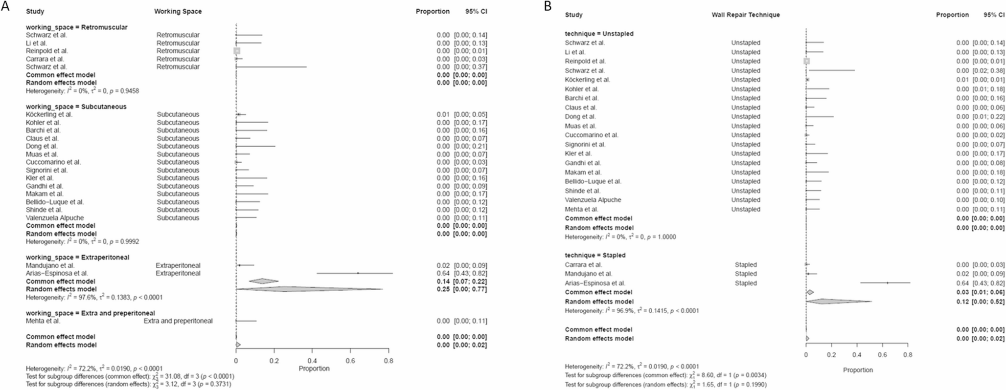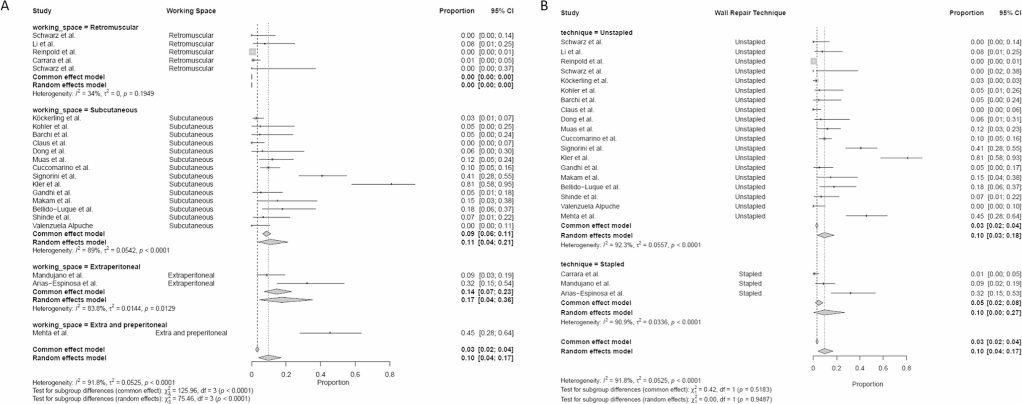 Twenty-two studies comprising 1,616 patients were analyzed. Mean age was 45.6 years, BMI 30.5 kg/m², with a mean follow-up of 10.5 months. All studies were non-randomized and rated as having a “Serious” risk of bias using the ROBINS-I tool. Recurrence occurred in 19 patients (0.99%), with no significant differences between subcutaneous and retromuscular approaches (0.93% vs. 1.16%, p = 0.802) or between stapled and fascial plication techniques (0% vs. 1.18%, p = 0.090). Seroma rates were significantly higher in the subcutaneous group compared to retromuscular approach (11.8% vs. 0.70%, p < 0.001). SSIs were more common in subcutaneous approaches (2.33% vs. 0.58%, 0.005). Bleeding was low across all groups (1.3%), with higher rates in the stapled compared to the fascial plication group (6.39% vs. 0.37%, p < 0.001).