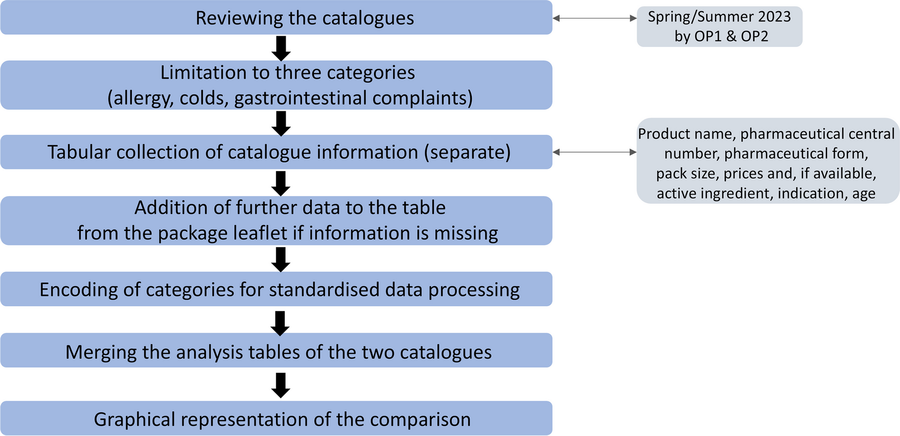 The current analysis is based on the spring/summer 2023 product catalogues of the online pharmacies OP1 and OP2. Figure 1 shows the methodological procedure for catalogue analysis in this study. Both online catalogues of OP1 and OP2 are freely available online and could be requested free of charge as a paper catalogue from the online pharmacies during the period of validity. The catalogues present and advertise a selected part of the product range of both pharmacies for self-medication and are divided into areas of symptoms. The product catalogue of OP1 consists of a total of 70 pages including cover and back, and the catalogue of OP2 comprises a total of 40 pages.
